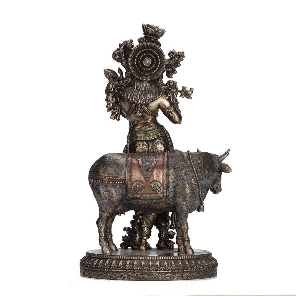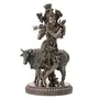 HomeHomeSpiritualIdolsWOOD CARVING WORK Polyresin Krishna Playing Flute Idols With Kamdhenu Cow Statue-Height-10.5 Inches-Carving Krishna With Flute Brown