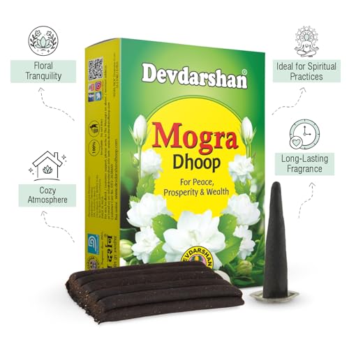 Transform your home into an enchanted sanctuary of peace and spirituality with Devdarshan Mogra Dhoop. The sweet Jasminum Sambac (Mogra) fragrance will gently float its way throughout your home instantly lifting the mood and creating a kind and inviting atmosphere. SAFETY INSTRUCTION: Always Keep burning dhoop / Incense sticks on dhoop / Incense stand / holder make sure you keep away from flammable articles ashes should always fall on fire proof or heat resistant surface.