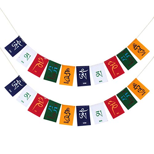 • Tibetan Buddhist Prayer Flag is inscribed with auspicious symbols invocations prayers and mantras. The Mantra printed on the flags is Om Mani Padme Hum.