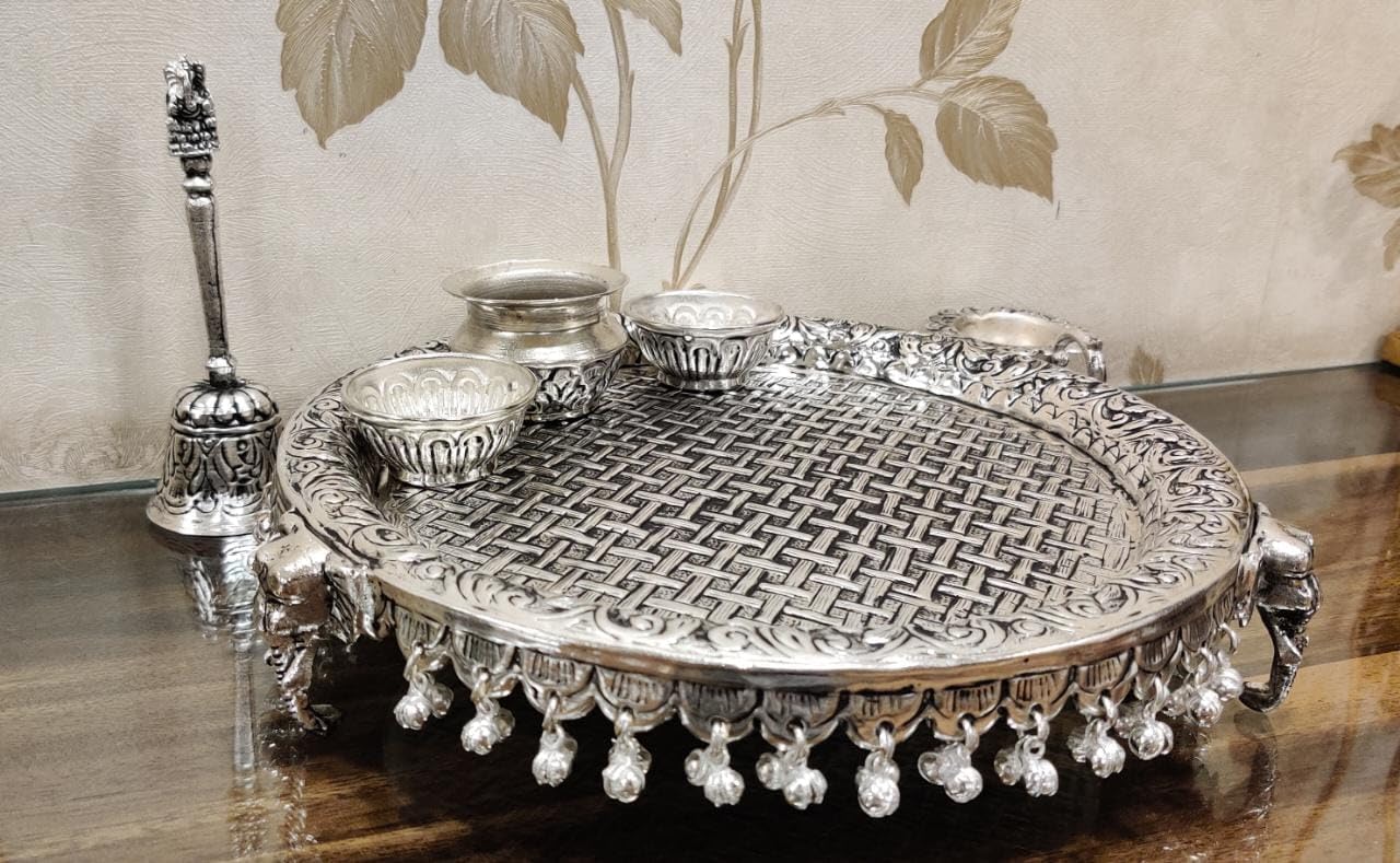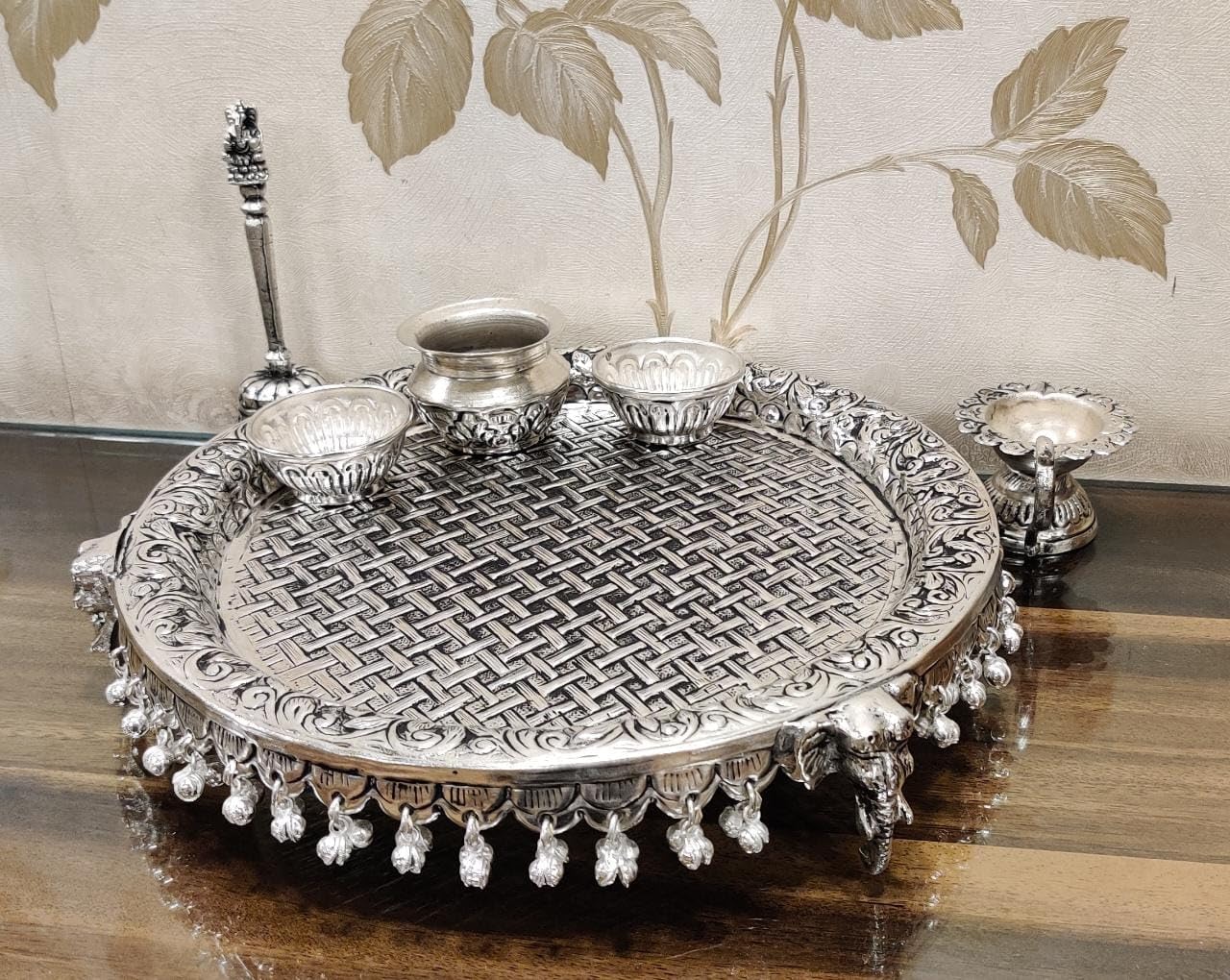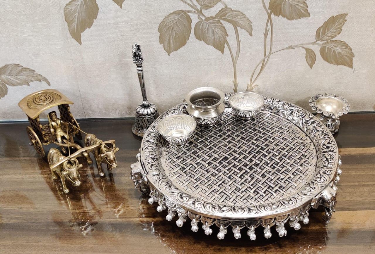 Traditional German Silver Coated Pooja Plate Set Every human being wants to have a Spiritual Connection with their Almighty and Prayer is the best way to have that Spiritual Connection. We try to make those prayers auspicious and as traditional as possible. Product Details: The Pooja Set is made of German Silver Coating and consists of all traditional items used in the Pooja. Benefits: German Silver is one of the materials that humankind has been using for some time. Keeping its benefits in mind and with advanced technology Usage: This Plate Set can be used while performing different Poojas on different occasions like Rakhi Karwa Chauth Diwali Pooja and other Pooja's. Cleaning: For cleaning use a soft sponge and liquid soap. German Siler will maintain its Glossiness. Preservation: German Silver is the friendliest metal in the environment and is easy to recycle making it the greenest natural metal. To make its life longer always dry them after washing with a cotton cloth and keep them in a dry place. If items are not in use store them at a dry place in a dry plastic bag.