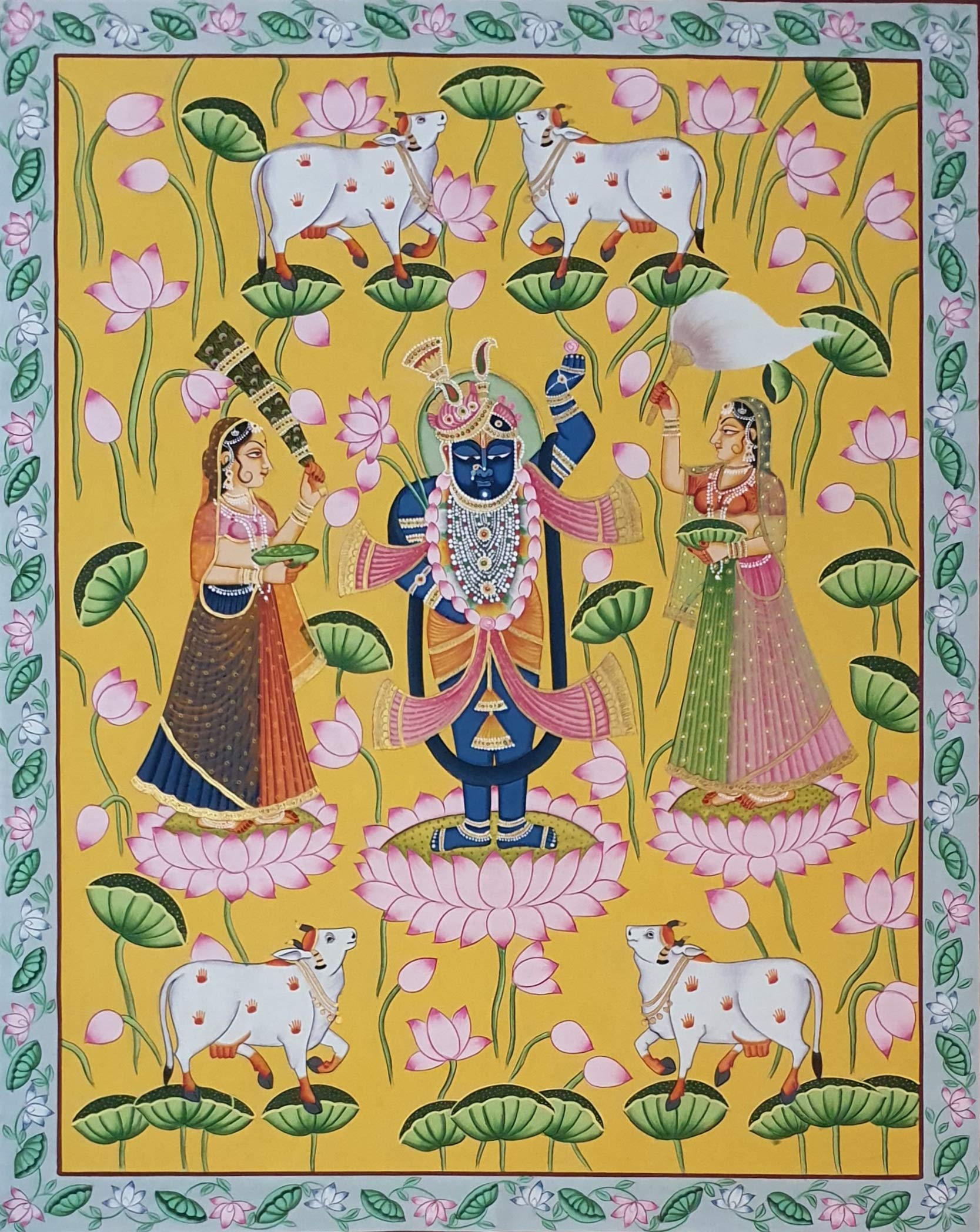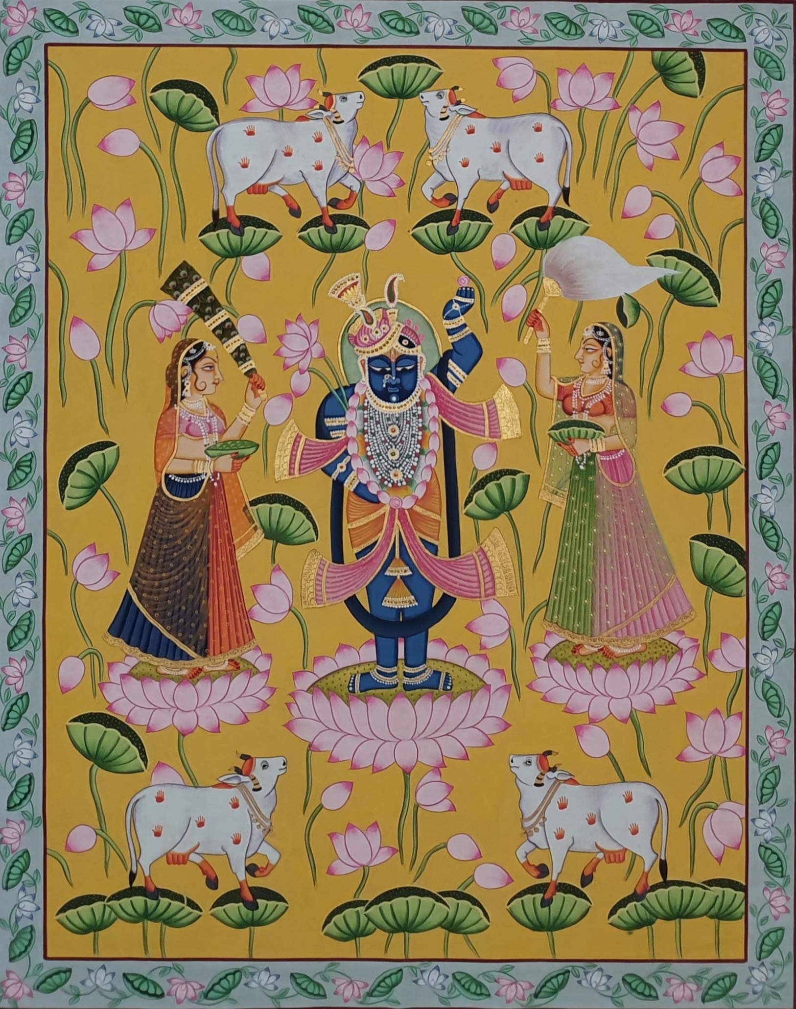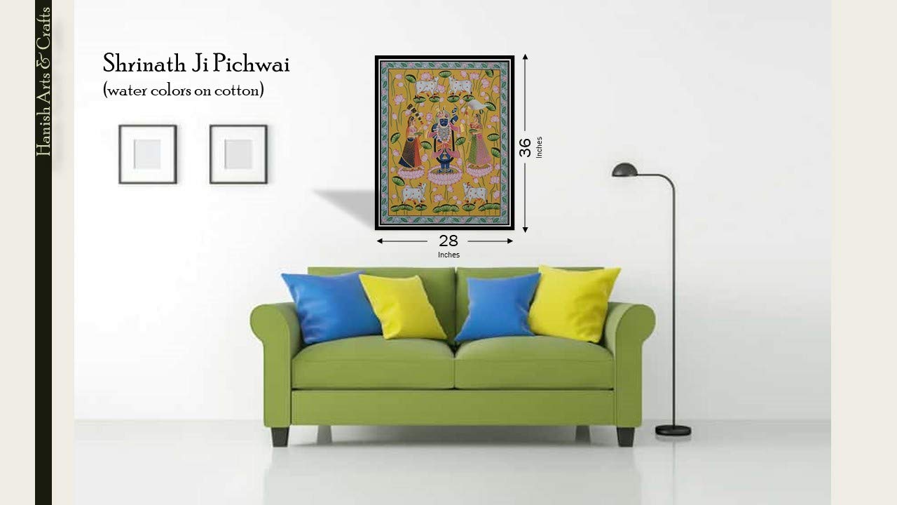 A beautiful painting involves the action or skill of using paint in the right manner; hence the end product will be a picture that can speak a thousand words they say. Arts have been in trend for quite some time now. Pichwai (pichvai) is a style of painting that originated over 400 years ago in the town of Nathdwara near Udaipur in Rajasthan India. Intricate and visually stunning pichwai paintings made on cloth depict tales from Lord Krishna's life. Pichwai (pichvai) is a style of painting that originated over 400 years ago in the town of Nathdwara near Udaipur in Rajasthan India. ... Lord Krishna is often depicted as Shrinathji in Pichwais which is the deity manifest as a seven-year-old child. You can gift this to a family or a friend. The painting has various forms of certain figures on it as seen in the image. You can add a good set of lights to the place where the painting is and the decor will give a different feel and look to the place. Quality and durability the painting has a matte finish.