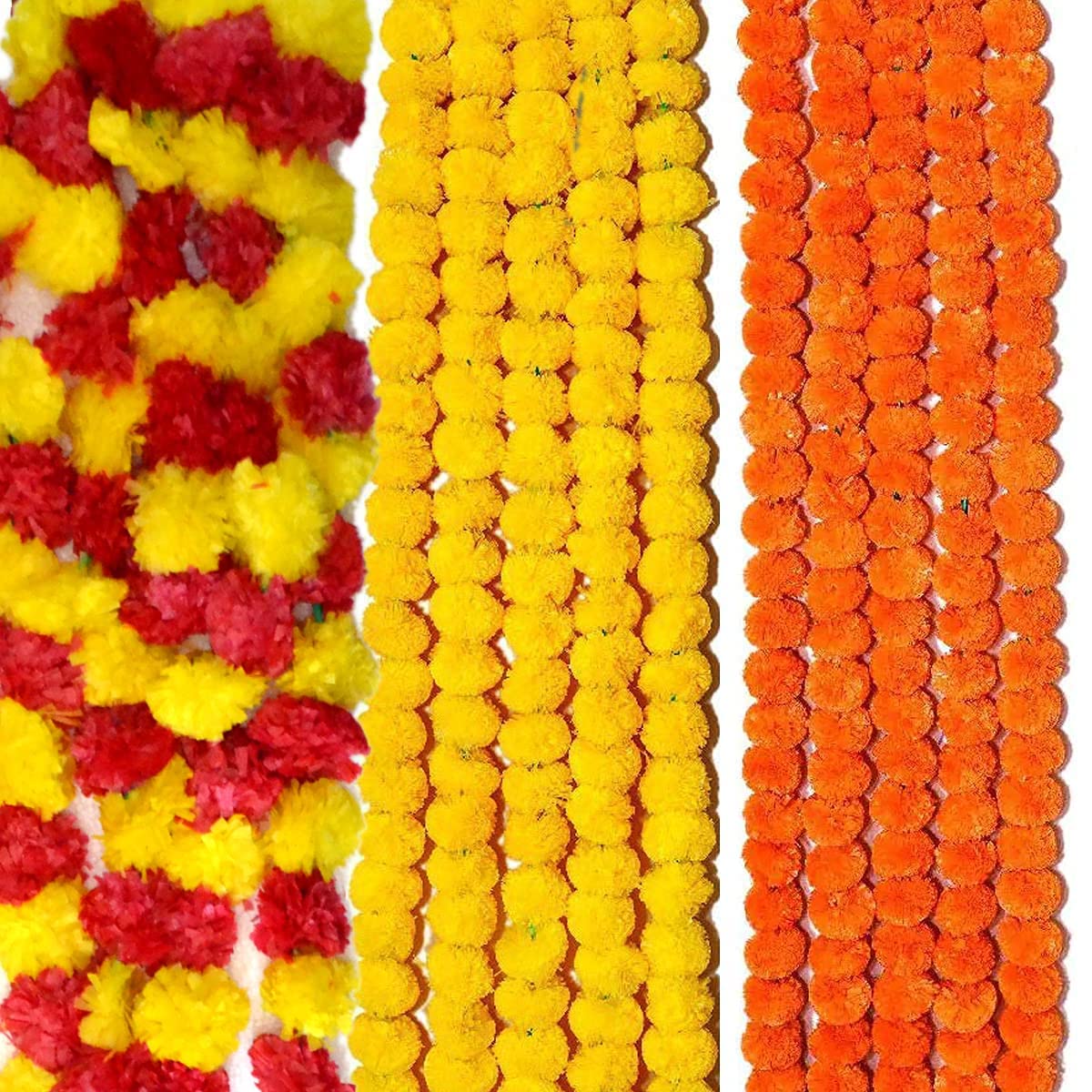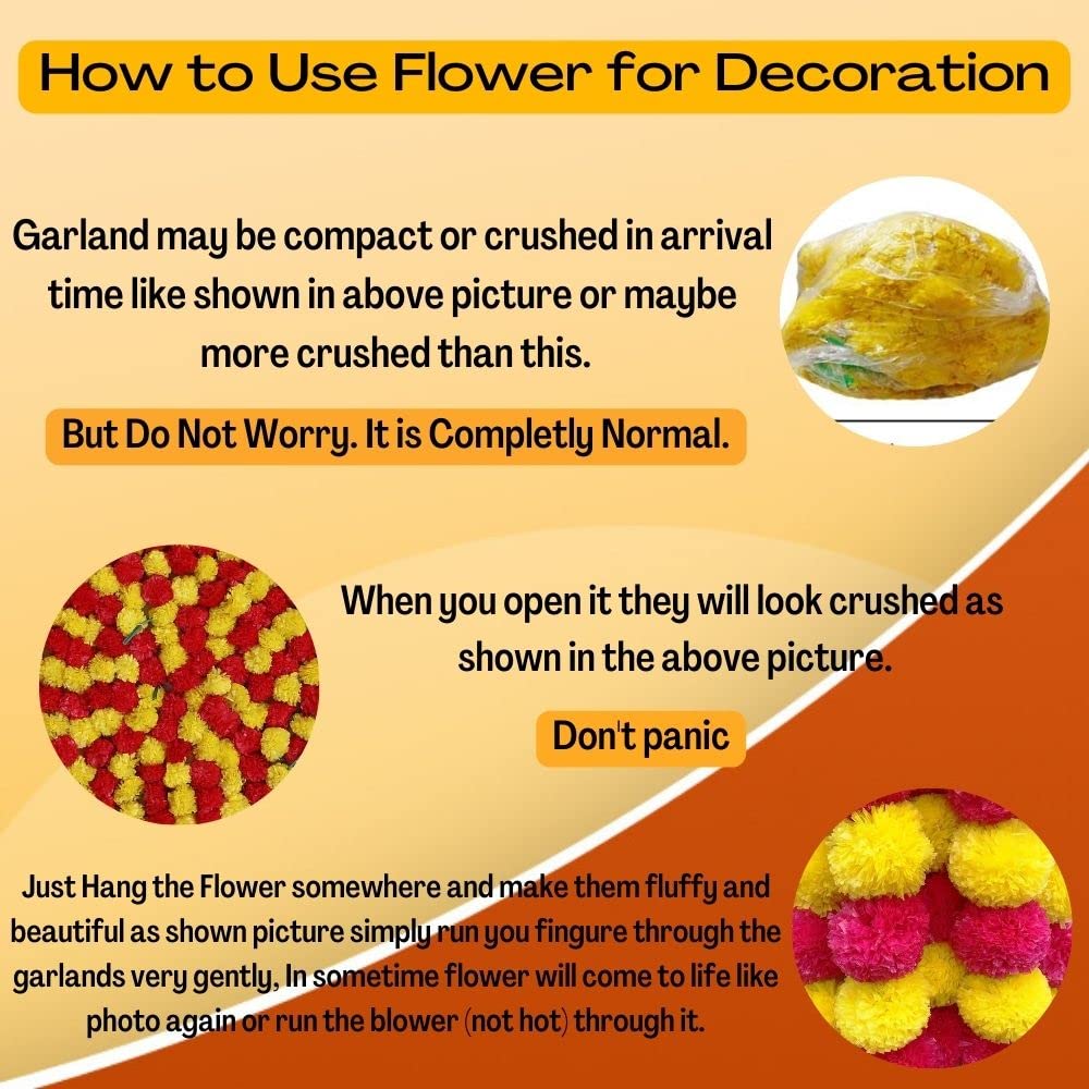 • Garlands may be compact in arrival time. To make them Fluffy and Beautiful like in the pictures simply run your fingers through the Garlands or use a blow dryer to add some volume. This will make them look like natural Marigold Flower.