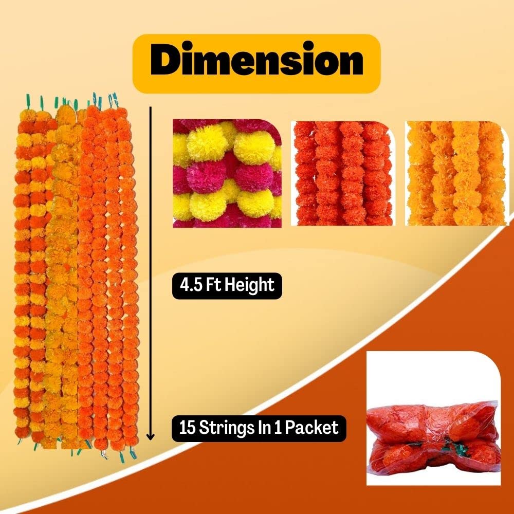 Artificial Marigold Fluffy Flowers Door Wall Hanging Garlands String for Diwali Decorative Items for Home - Pack of 15 (Each 5)
