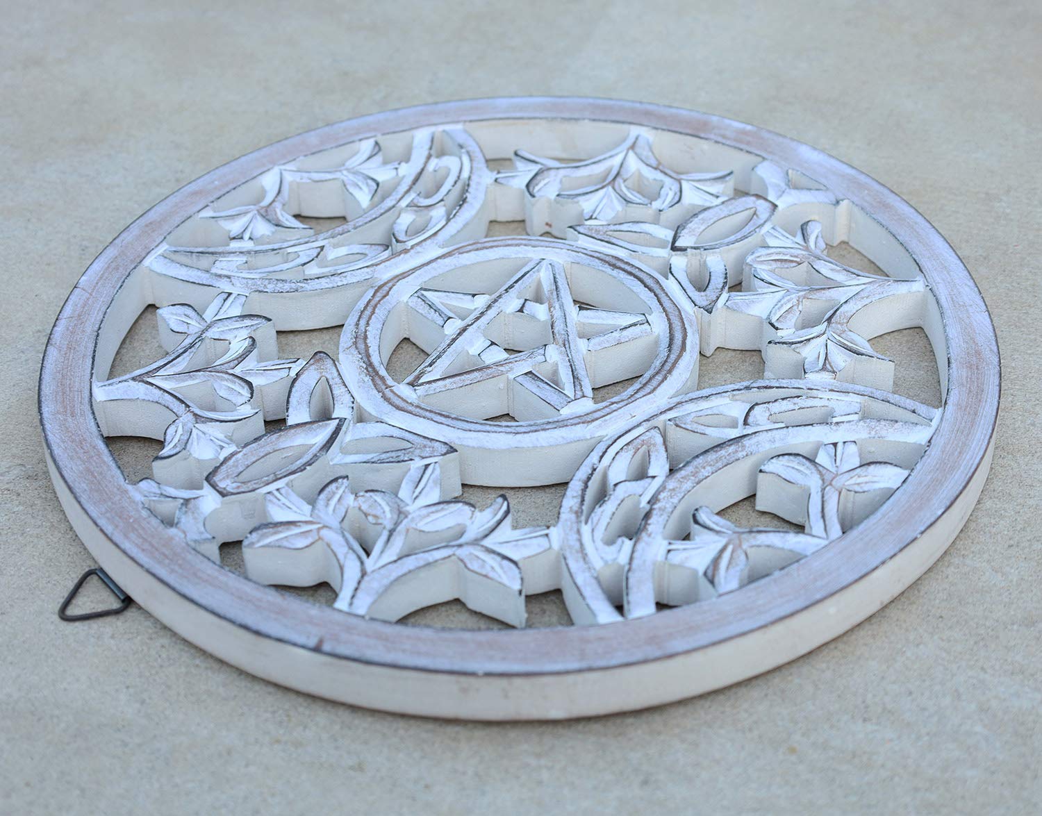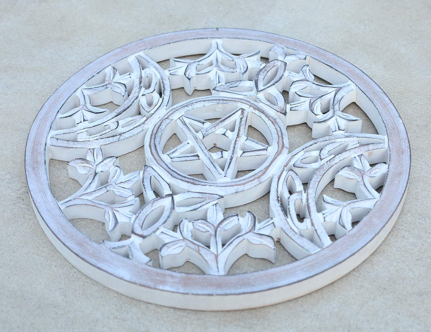 DESIGN: This solid recycled wood MDF features intricately carved deep Triple Moon design.
