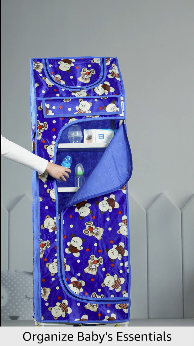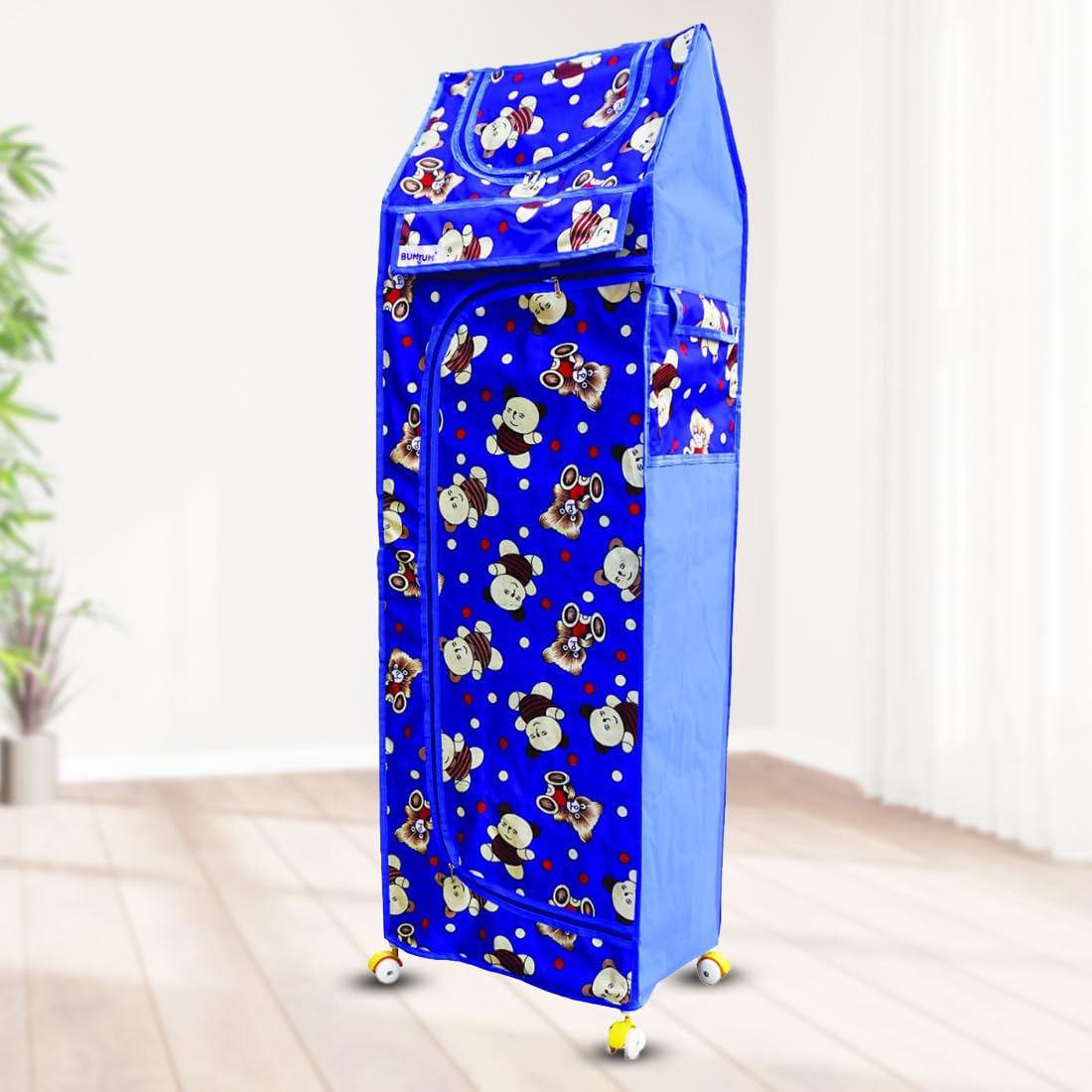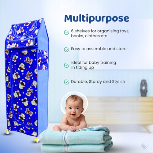 BUMTUM Baby Wardrobe Multipurpose 6 Shelve |Foldable Almirah| Baby Wardrobe for Clothes Storage | Baby Wardrobe Cover | Baby Wardrobe Wheels (Teddy Print Blue)