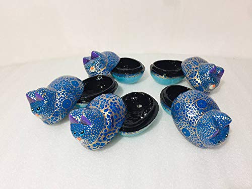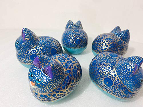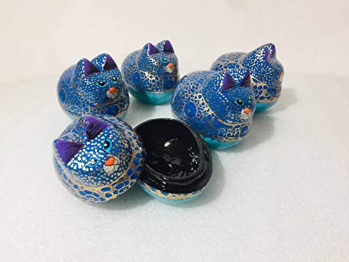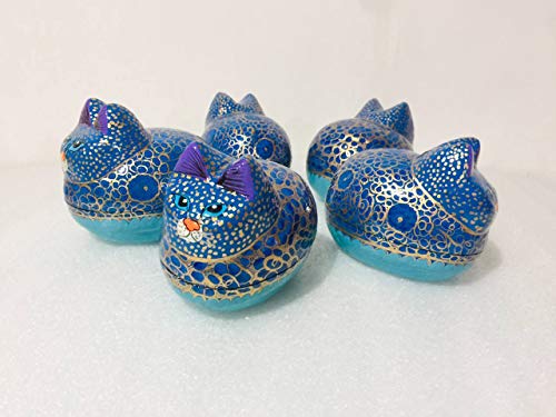 Cat box set of 5 4 inch size handmade cat box hand painted paper mache cat box paper mache box with lid from India To decor up your shelf with a piece of classic beauty handcrafted is a paper Mache cat which has been painted into a mix color to bring life vigor and an animal charm to your living space. The elaborate process of paper Mache recycles paper to create wonderments for your home such as this one. Let this classic and exclusive piece of decor spread color and warmth within your home.