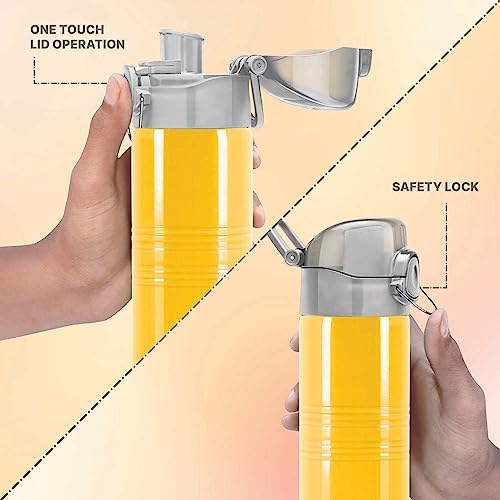 Made of superior quality Rust Proof stainless steel Vogue bottle comes with a one-touch mechanism to unlock the lid that shields the spout from dust. Always in style always in vogue this bottle is the perfect accessory for all your sporty adventures. This water bottle is made from high-quality stainless steel which is known for its durability resistance to rust and non-toxic properties. Stainless steel is a safe material for storing beverages and doesn't leach chemicals into the contents. This steel water bottle have leak-proof designs including tight seals and secure lids or caps. This prevents accidental leaks or spills making them suitable for carrying in bags or backpacks. This Bottle is unique in shape it has leak proof technology which make this product easy to carry at school travelling and work it is Odour Free and 100 percent Food Grade. Stainless steel is easy to clean and maintain.Using a steel water bottle is an environment friendly choice as it reduces the consumption of single-use plastic bottles.
