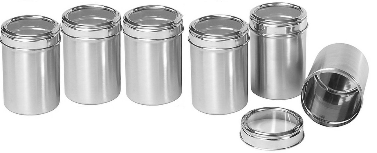 Stainless Steel Kitchen storage Canisters with see through lid - Set of 6 - Size 8,9,10,11,12,13 Stainless Steel Kitchen storage Canisters with see through lid - Set of 6 - Size 8,9,10,11,12,13; 6 piece set of canisters / kitchen storage made up of stainless steel and being very high quality and extremely durable and rust free. Having mirror at the top helps to see through the items easily without opening the same. Canisters having 500, 750, 1000, 1250, 1500 & 2000 ml respectively