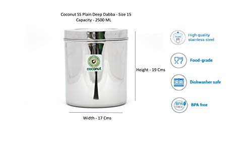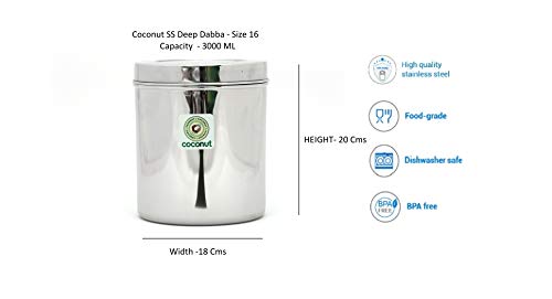 Coconut is range of innovative and quality products for Home and Kitchen. Crafted from High-Grade Stainless Steel which will not crack or rust. Container have enough Deep Space for storing Edibles Grains Snacks etc. Compaq size makes it easy to store in kitchen cupboards. Easy to clean and wash they have very exotic silver shining. Product Content : Coconut Stainless Steel Plain Deep Dabba /Storage Container Capacity - 2000ML 2500ML & 3000ML (Size - 14 Dimension - Width -15.5 Cm & Height -18 Cm ) ( Size -15 Dimension - Width -17 Cm & Height -19Cm) ( Size -16 - Dimension - Width -18 Cm & Height -20Cm)