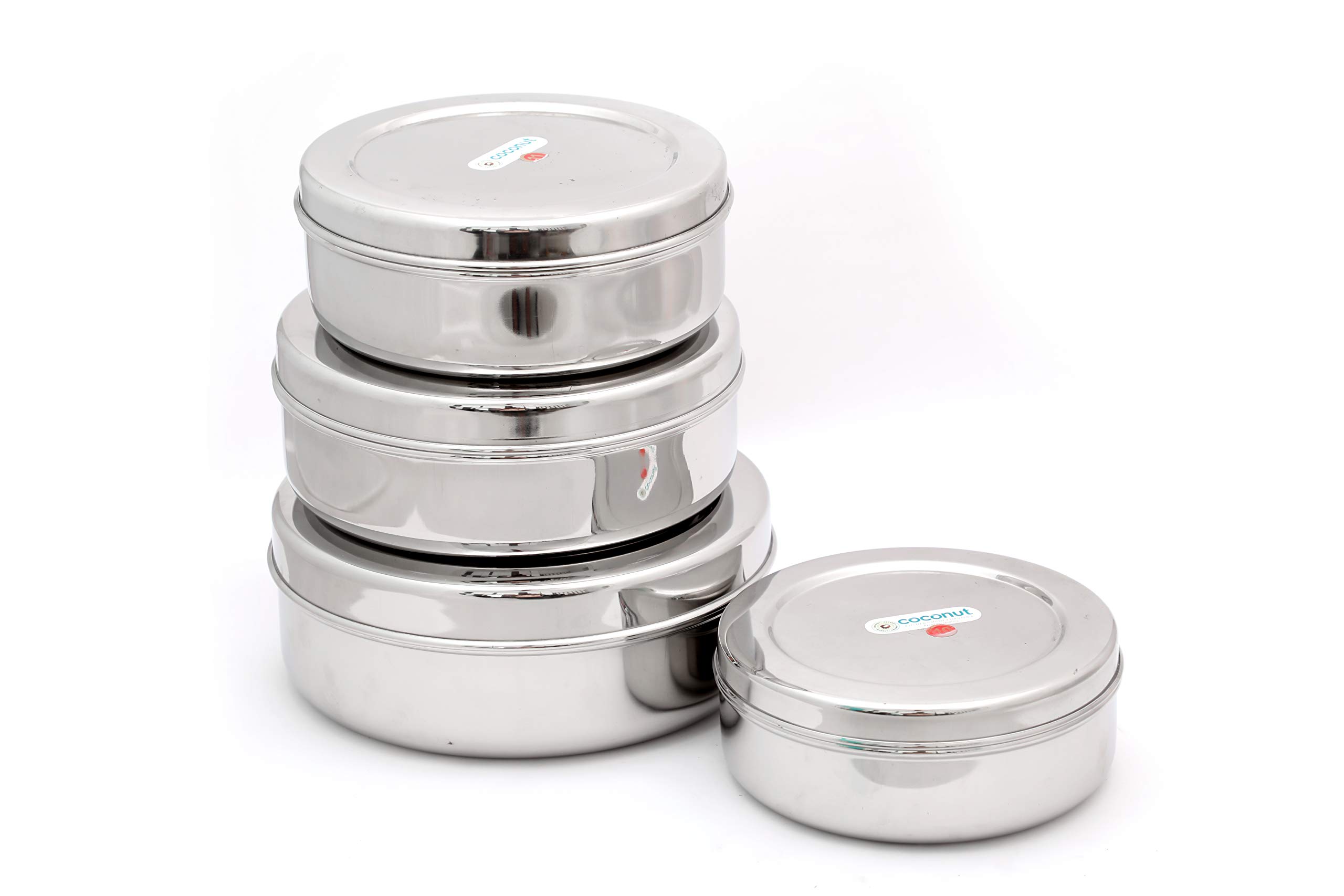 Coconut is range of innovative and quality products for home and kitchen. Through canister can used to store Puris Rotis Parathas Snacks Khakhara mukhwas dryfruits choclates buiscuits etc. This flat storage container is rust proof and hygienic. Made from 100% food grade stainless steel making it highly durable and resistance to corrosion. When not in use smaller container can be stacked inside bigger container saving lot of storage space.Container Set of 4 (Container 1- 10.5 Inches Width & 3 Inches Height Container 2- 10.9 Inches Width & 3.3 Inches Height Container 3 - 11.4 Inches Width & 3.5 Inches Height Container 4 - 12 Inches Width & 3.75 Inches Height respectively)