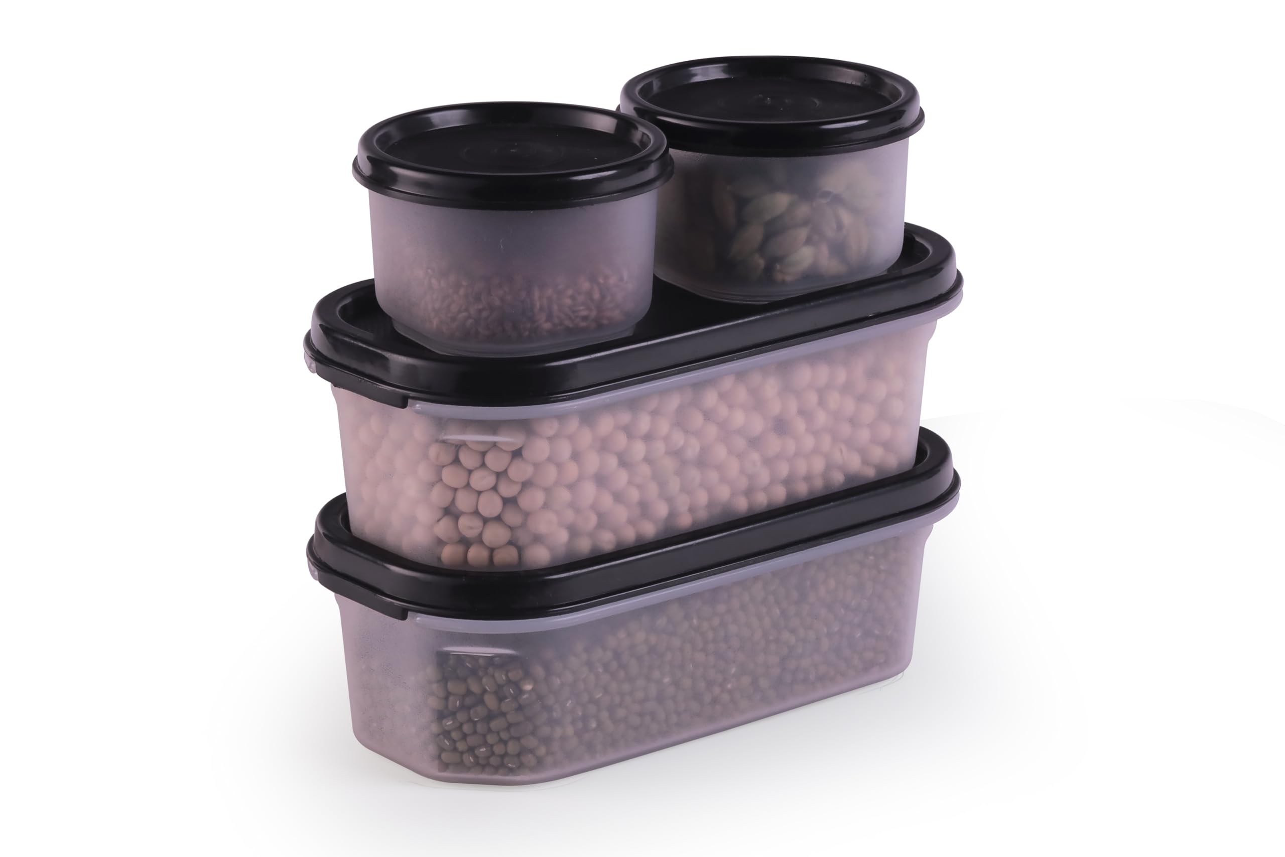 HomeKitchenContainersJars & ContainersOliveware Modular Storage Containers with Airtight Lid BPA Free For Pulses Rice Dal & Atta Set of 4 (2x600ml 2x180ml) - Black