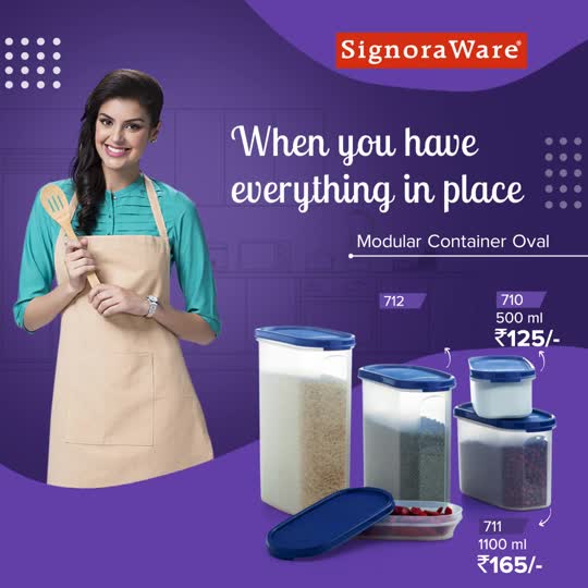 SignoraWare is one of the leading plastware companies in India, with quality par excellence when compared to any other international plastware brand. With its well-equipped R&D Department, team of technical experts and warehouse capacity of over 150,000 sq. ft., SignoraWare is committed to setting new benchmarks of superior products for its valued customers.The kitchen is the heart of your home. Make it livelier with the all-new range of SignoraWare products. Our widest range of products include lunch & outdoor, thirst quencher, smart series, magic sprinklers, easy flow, modular kitchen containers, mini wonders, cooking range, microwave reheating & serving and serving tableware. Inspired by you, our products are just as smart, versatile and reliable. In short, they are your joyful companions that care for you and your family.