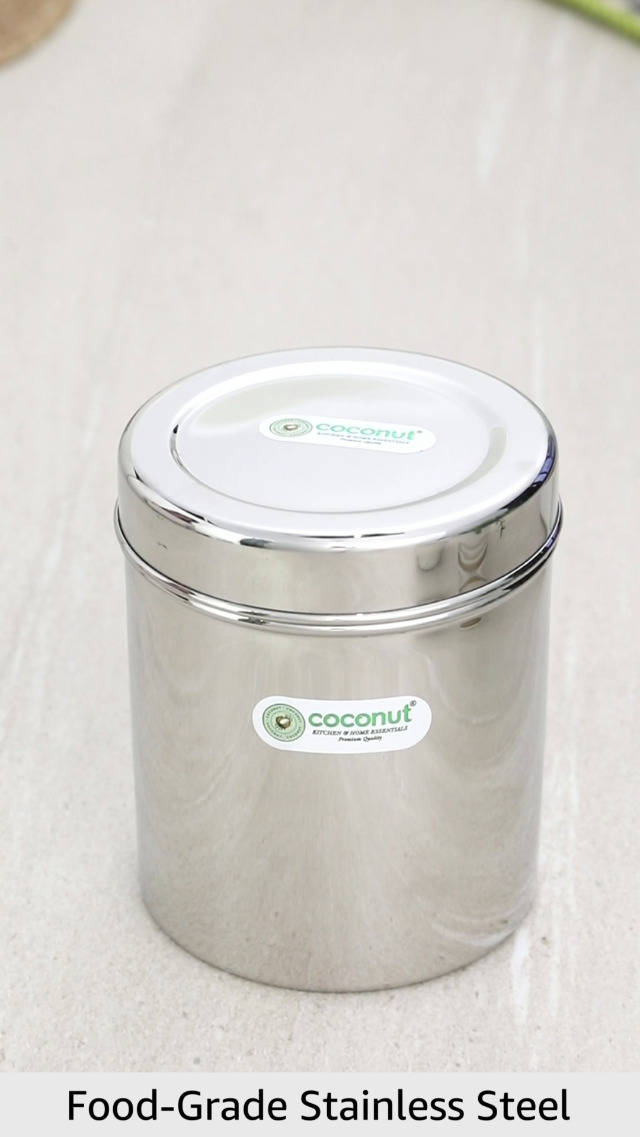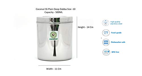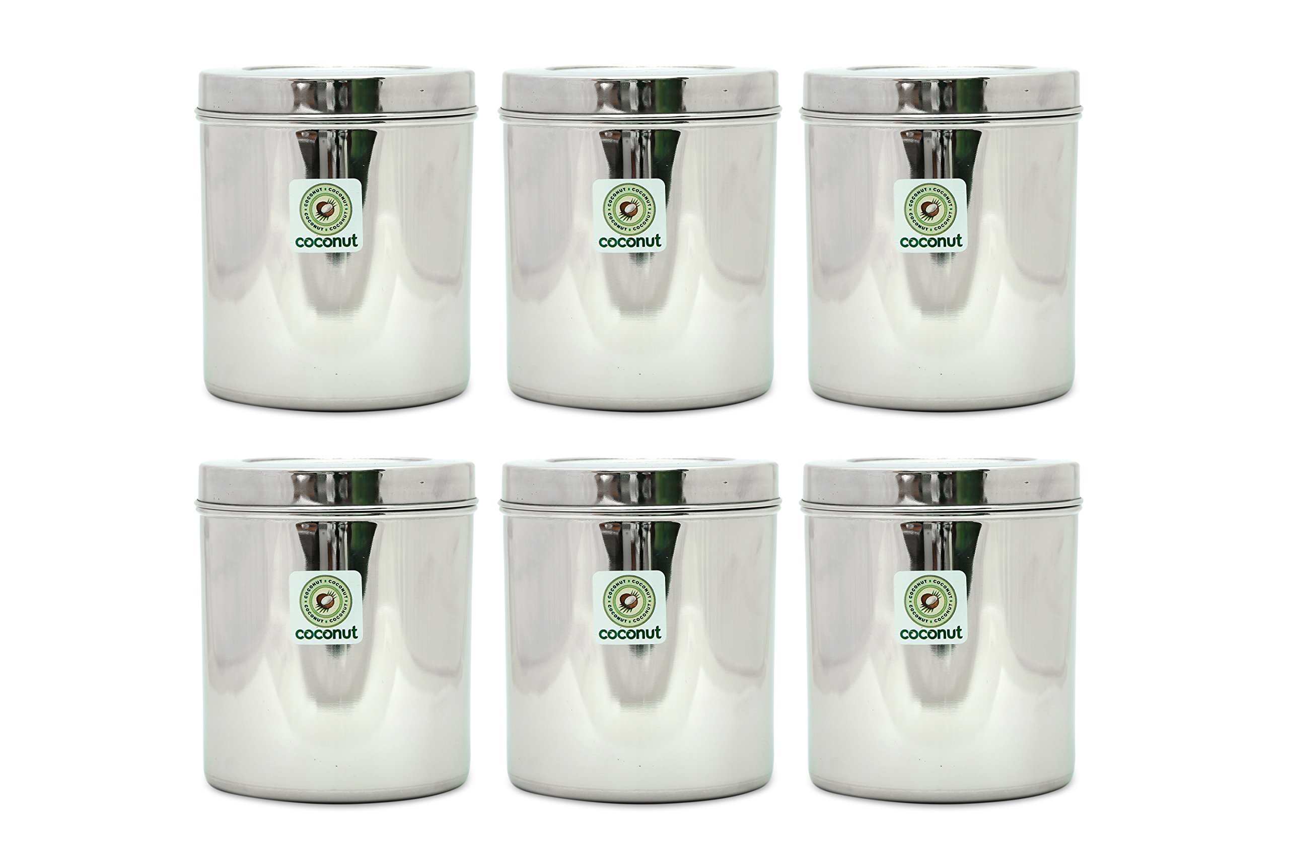 Coconut is a range of innovative and quality products for home and kitchen.Its made of 100% food grade stainless steel.These multipurpose canisters can be used to store Food products and are easy to clean/maintain.It is ideal for organizing your kitchen cupboards and as well as looking elegant stylish display.This Plain Deep Dabba is easy to clean and maintain. Its long durability product.Product Content - Pack of 6 Containers (500ML EACH)