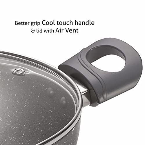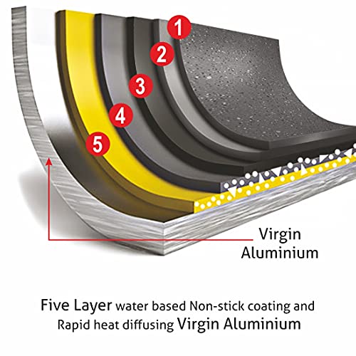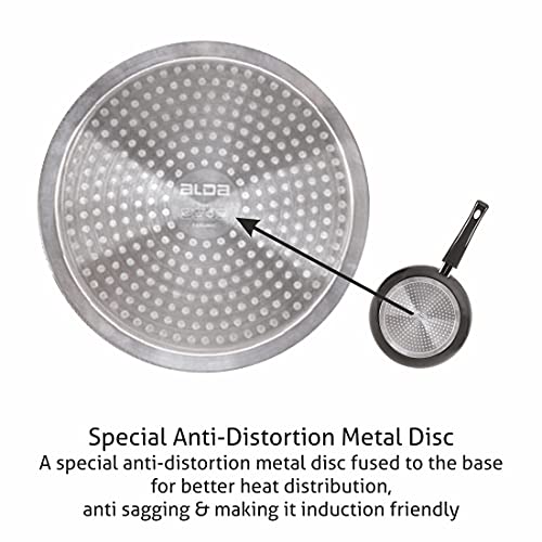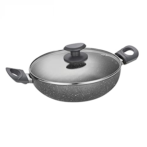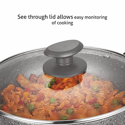 The Alda non stick Marbello wok pan is perfect for making curries gravies and deep frying purposes. It is made of highly efficient five layer water based non stick coating. The body allows optimal heat distribution & rapid cooking. The surface has high level of scratch & wear resistance. It gives outstanding non stick effect for oil free cooking. The ergonomic cool touch handles provides a safe & comfortable grip while cooking. This wok pan comes with a glass lid for easy monitoring of foods being cooked.