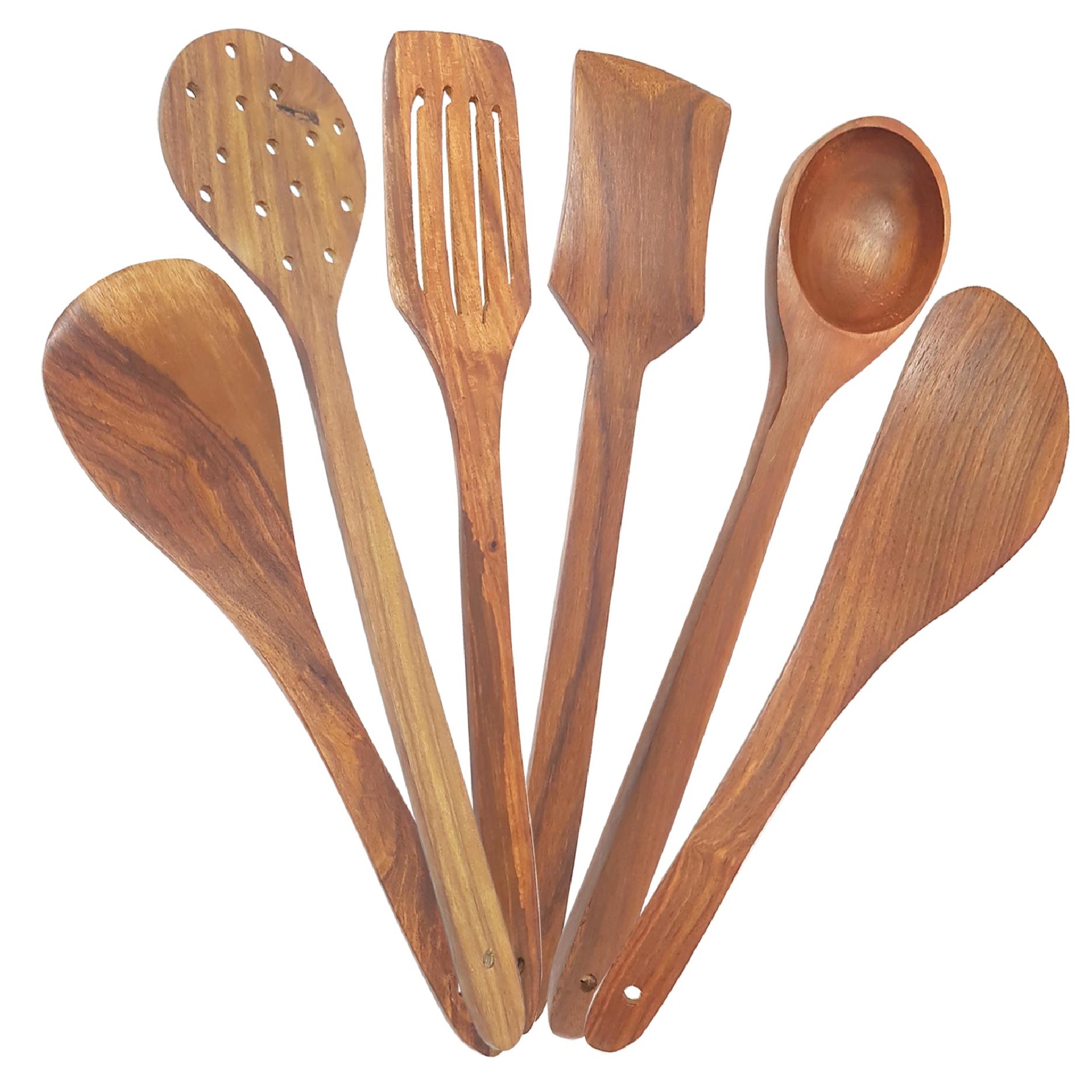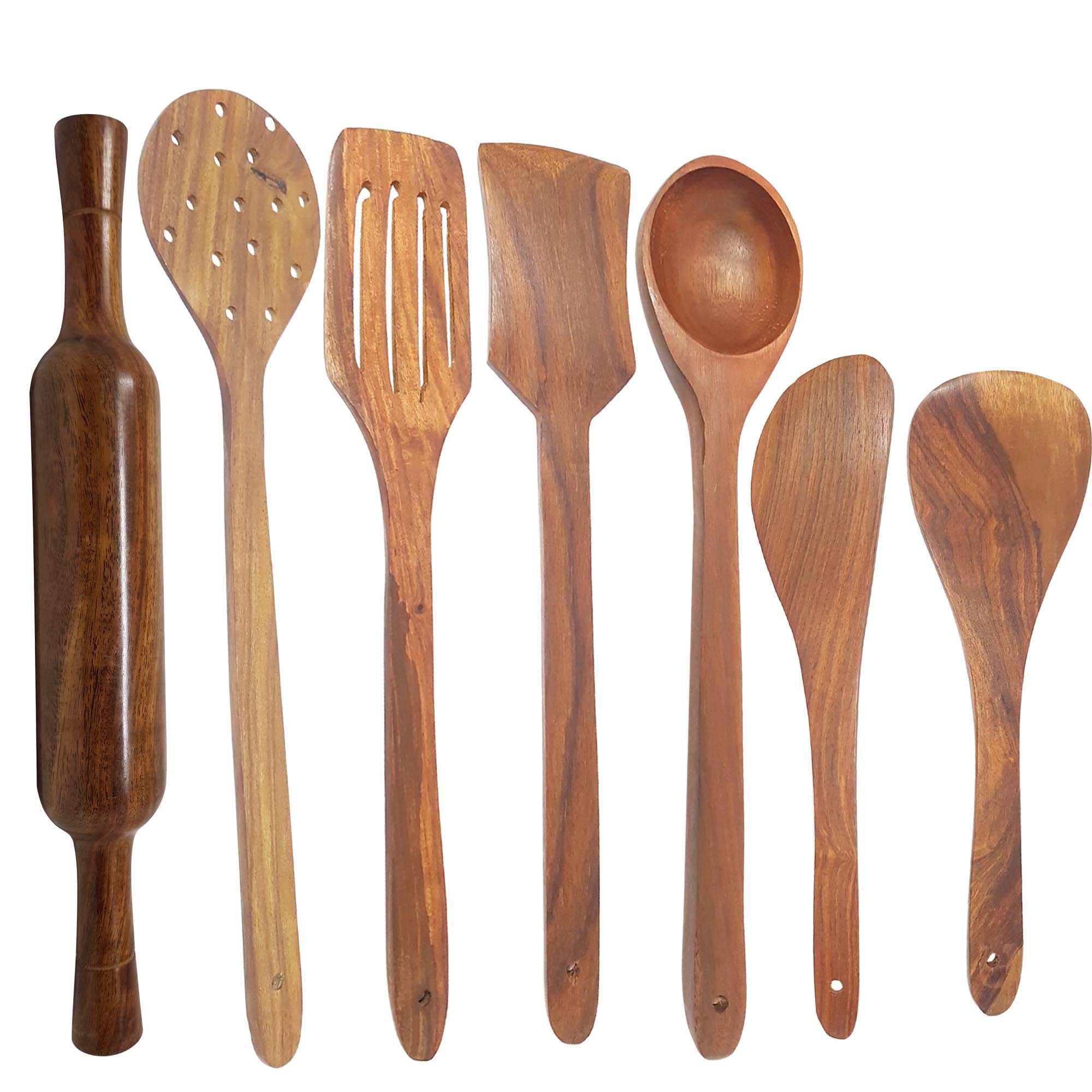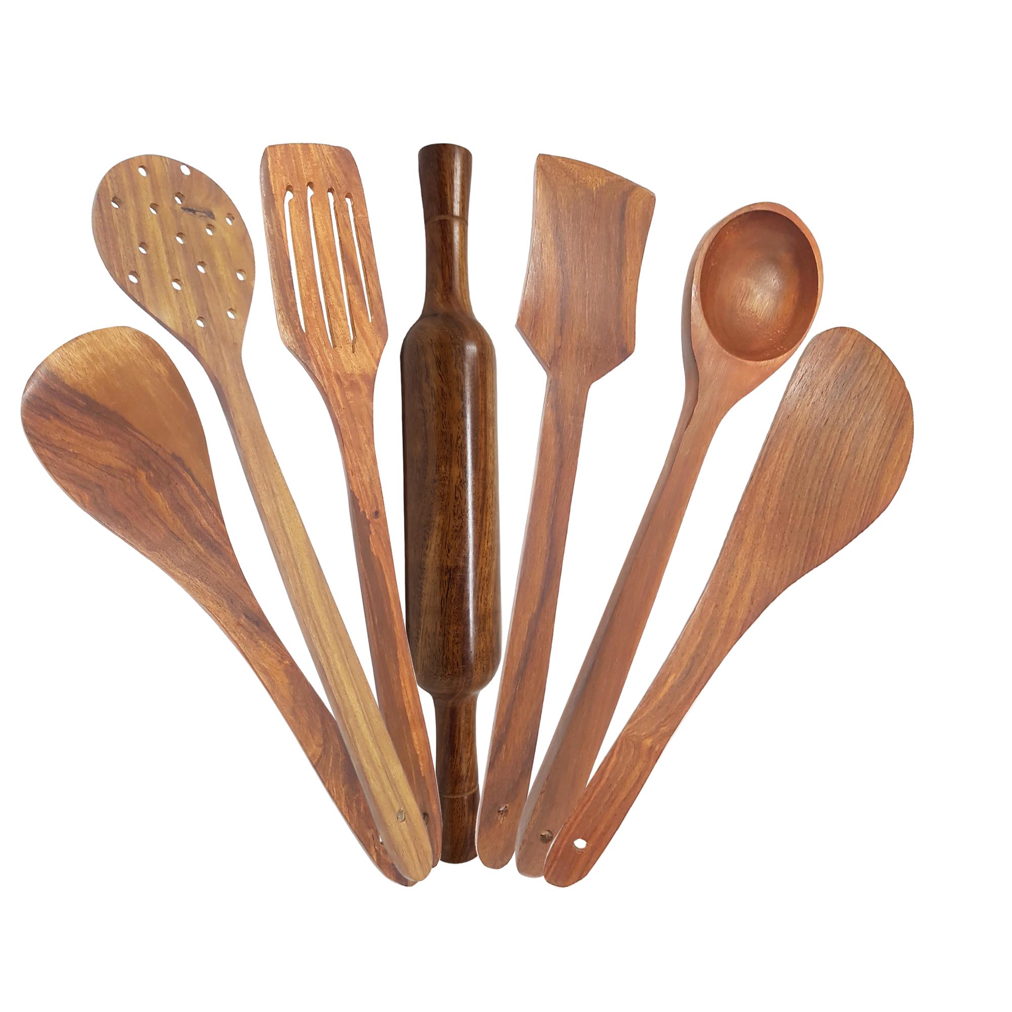 For those who love to cook, BuzyKart presents this beautifull Wooden Ladle Set of 7. BuzyKart Traditional Hand Carved Cooking Accessories, Out Of Best Quality Long Lasting Processed Natural Wood. Unmatchable Elegance Adorning Your Lifestyle . It Reflects On That Artistic Side Of You And Dwells In Perfection Of Artistic Work. Add It To Your Kitchen Accessories Before You Regret Losing It To Others. It Contains 6 Cooking Spoons and one rolling pin (belan). Which Can Be Used For Different Purposes. Perfect For Serving Meals, Our Set Of 6 Piece Cooking Spoon Wooden Ladle Features A Soft Handle For Comfort And Ease Of Use Whilst Handling. The Wooden Curve Spoon Is Ideal For Serving Variety Of Dishes. With A Hole In The Handle That Can Be Hung Over A Hook Out The Way, Our Set Of 6 Piece Cooking Spoon Wooden Ladle Can Be Stored Efficiently To Keep Your Kitchen Surfaces Neat And Organised. Wash them carefully with soft and smooth scrubbers to avoid scratches.