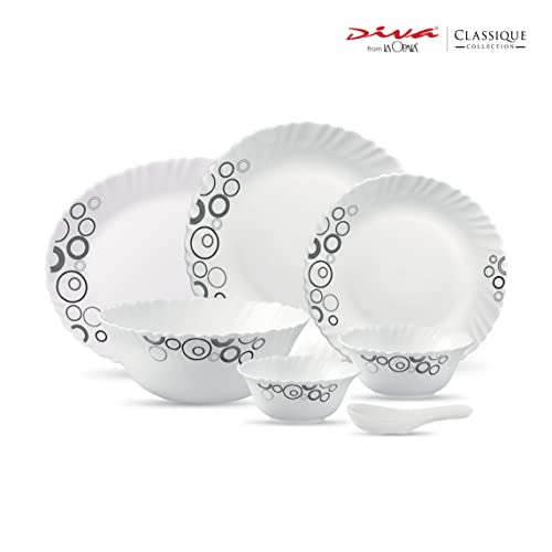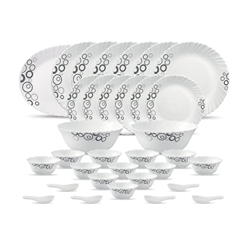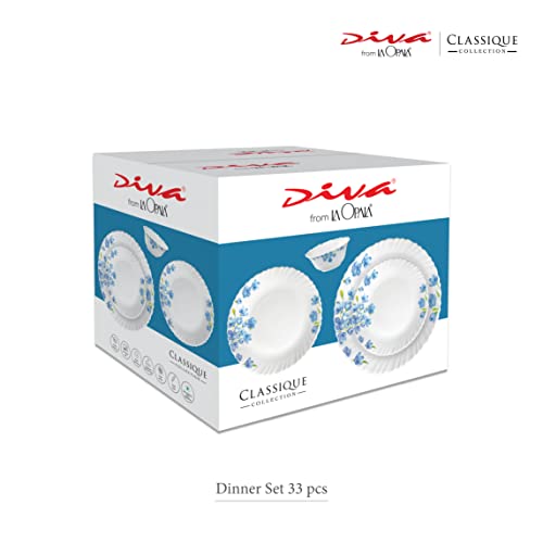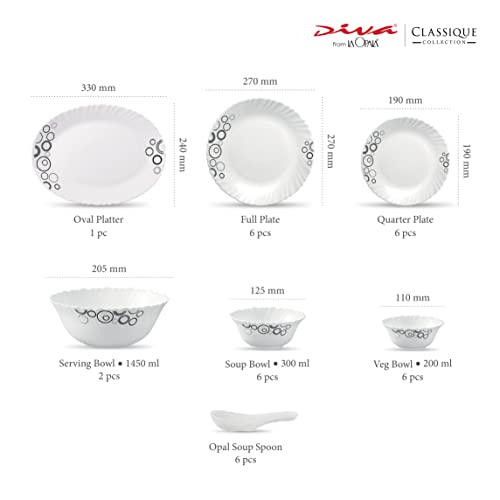 Diva From La Opala Classique Collection Opal Glass Dinner Set (33 Pcs Misty Drops White)