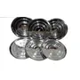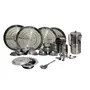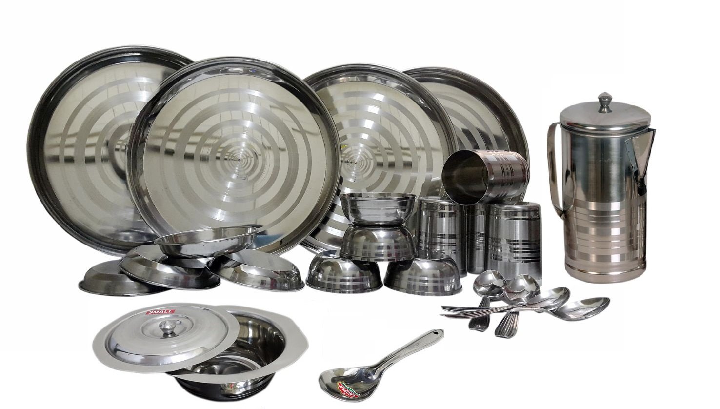 24 pcs Stainless steel Dinner Set; Let your kitchen speak volumes about your refined taste while Serving everything neat and organised. This 20 Pcs Dinner set will make a perfect utility item while adding a stylish edge to your Dinner table, This set is made from high quality stainless steel making it exclusive and durable, beautifully designed to add grace to your dining experience. also strong in construction and will not bend or have dents during normal use. This set can be nested one into another and therefore helping save shelf space in the kitchen Perfect for all kitchen needs. Capacity Bowls - 250 ml each, Halwa bowl - 190 ml each, Glass - 300 ml