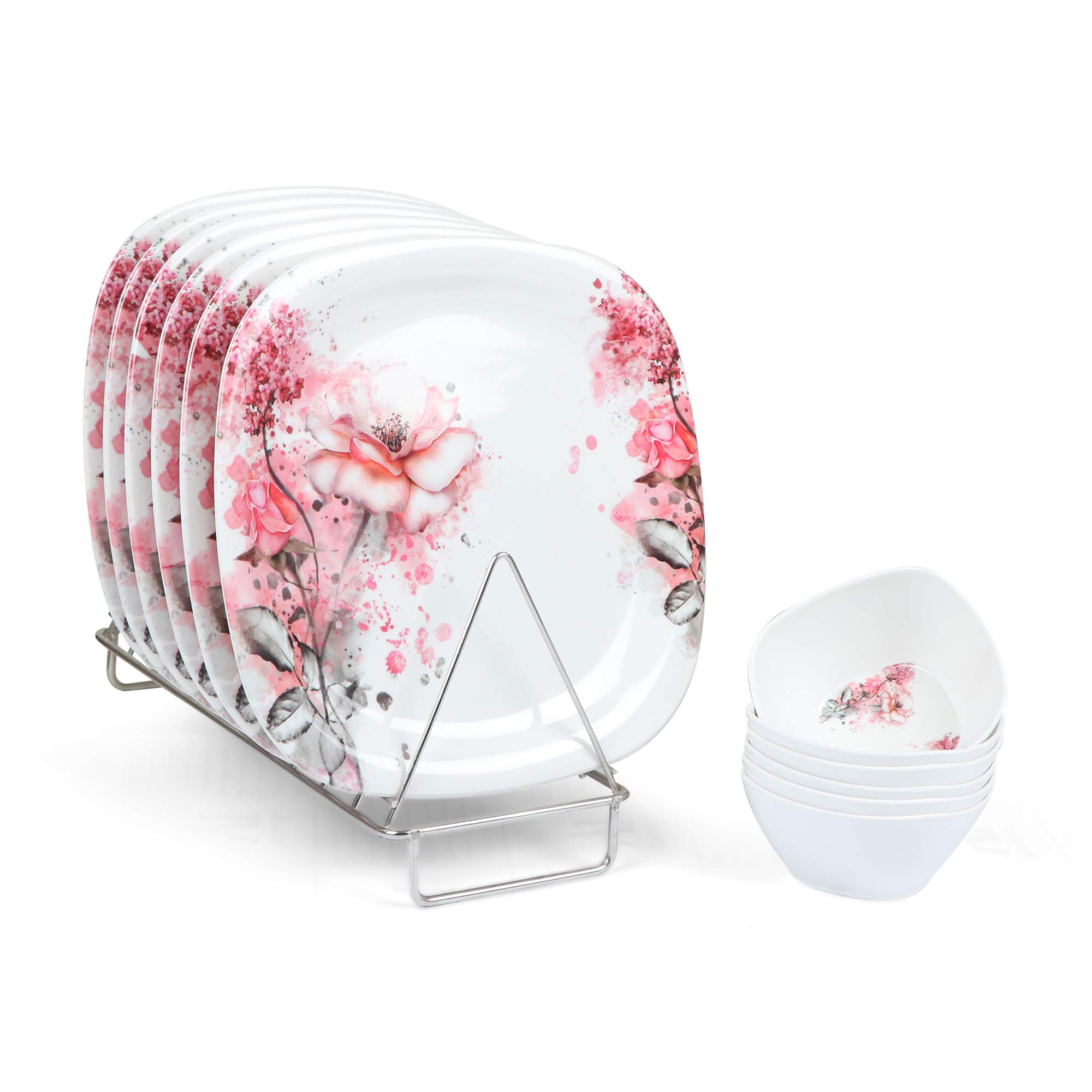Golden Fish White Base Floral Printed Melamine Full Size Square Dinner Plate(11 Inch), Veg. Bowl & Quarter Plates(7 Inch) Mini Dining Set (Set of 18)