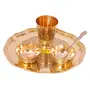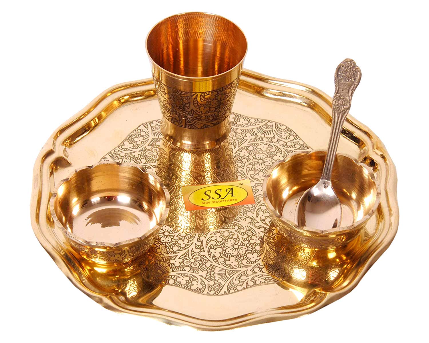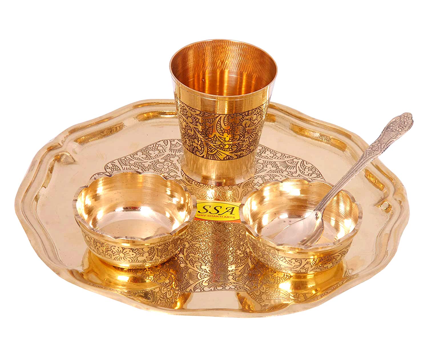 • Dimensions 5 Pcs Pure Brass Bhog Thali Pooja Set Color: Gold Material: Brass Weight: Approx 318 gm Pack Included 1 Plate 2 Bowls 1 Glass 1 Spoon. Thali: Diameter: 8" inch Height: 0.10 INCH Length: 8.00" INCH Weight: 144 gm Glass: Capacity: 80 ML Weight: 4