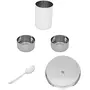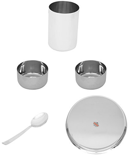 Vinod presents this silver color dinner set. It is made of stainless steel. This package contains 1 plate 2 bowls 1 glass and 1 spoon. It has seller warranty up to 10 years and the replacement warranty is available against manufacturing defects only.