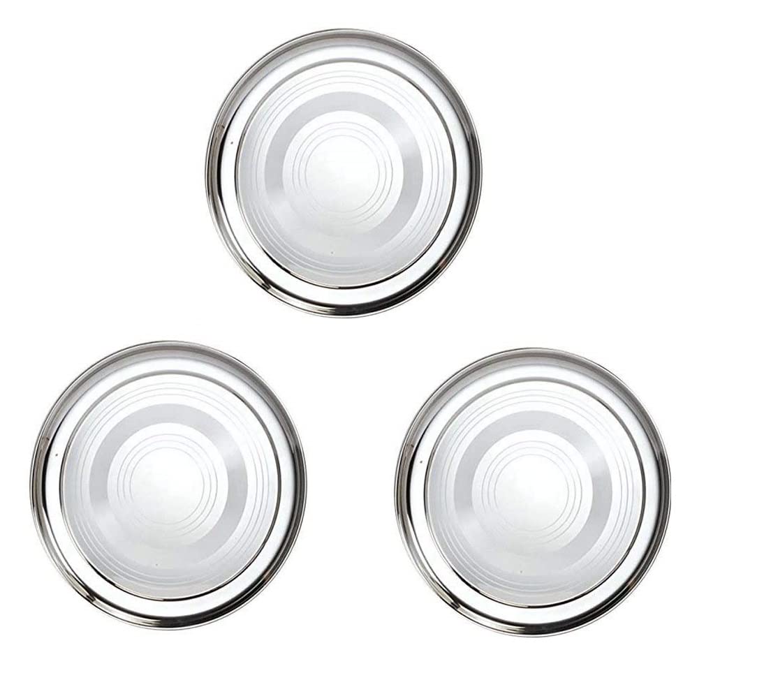Stainless steel round dinner plates thali set of 3 silver material: stainless steel Functional & fashionable - stainless steel surface preserves the taste and nutritional qualities of foods and is safe for food contact; copper - easy to clean - no re-tinning · An essential indian dinnerware to present indian foods like curries daal biryani & condiments for authentic indian dining experience · Uses: - used for serving entire lunch or dinner food items at the dinning table 29x29 cm