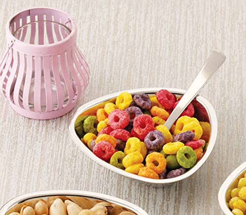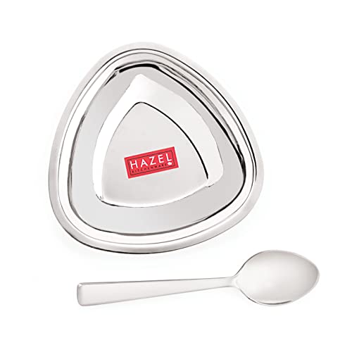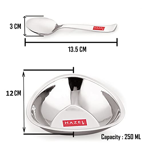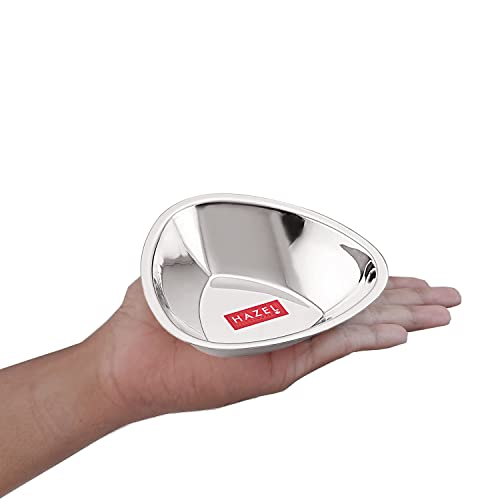 HAZEL Stainless Steel Serving Bowls Set With Spoon| Triangular Shaped Vati Katori Set of 1 | Fancy Serving Bowls For Snacks (1 Vati 1 Spoon) Capacity 250ml Each Silver This set has been beautifully designed to add grace to your dining experience. This bowl has elegant design which can suit any type of dinnerware collection. These bowls are made from stainless steel which prevents the bowls from rusting. Durable and attractive glass bowls. This set is made from high quality stainless steel making it exclusive and durable. This set has been beautifully designed to add grace to your dining experience. Easy to clean and wash they have very exotic silver shining. Easy to Clean Serving bowls. For storing and Mixing of ingredients. Use for Fruit Ice Cream Pudding Serving Kheer Dessert. This is a perfect gifting set at housewarming get-togethers weddings birthday parties and other occasions. Easy to clean and wash they have very exotic silver shining. It can be a great option for everyday use. Useful for storing or serving. When not in used each vatti can be stacked inside another vatti consuming lesser storage space.Compaq size makes it easy to store in kitchen cupboards. This Bowl can be easily cleaned and maintained. Vati Dimension : 12 x 12 x 3 cm (LxBxH) Weight : 100 Grams Capacity : 250 ML. Spoon Dimension : 13.5 x 3 x 0.1 cm (LxBxH) Weight : 30 Grams. 6 Months Manufacturer Warranty. This product is under 6 Months Warranty from the date of retail purchase against any manufacturing defects in material and workmanship. The Warranty does not cover damages resulting from accidents mishandling or tampering with the mechanism. Warranty valid against producing original bill endorsed by the seller.
