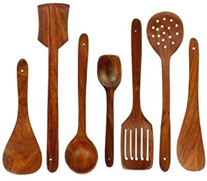 This spoon set is made from high quality wood. It contains 7 Spoons which can be used for different purposes.These wooden spoons are natural and made of Sheesham Wood and only Hygiene Polishes are performed on them. We recommend you wash the spoons in the boiled water before the first use for cooking purposes. After the wash the spoons will look dry on the surface but after several uses of the spoons they will get into a normal form of smoothness