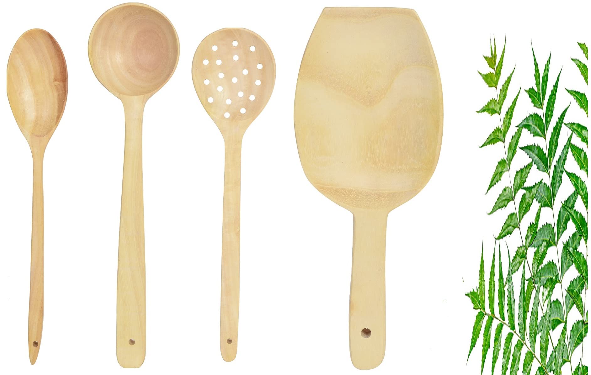 This Wooden Spatulas Made of Deshi Neem wood. We know that neem wood is a precious wood. Set of 5 Kitchen Spatulas are Safe for non-stick cookware. Get this wooden spoon cooking and serving. Dimensions: Length ranging from 28 to 38cm Spatulas are made from a single block of neem wood so it doesn't have any joints. No harmful shining polish is used which is harmful for health and prohibit the neem wood antibacterial function. The non-scratch wooden spatula is not going to leave any scratch on pan. Use mild soap and warn water for cleaning.