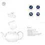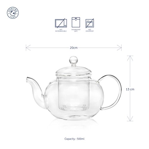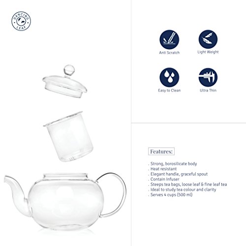 Features : Strong Borosilicate Glass Body Heat Resistant Elegant handle Graceful Spout Contains Matching Glass Infuser & Lid Steeps Tea Bags & Loose Leaf Tea Serves 4 cups (500 ml).