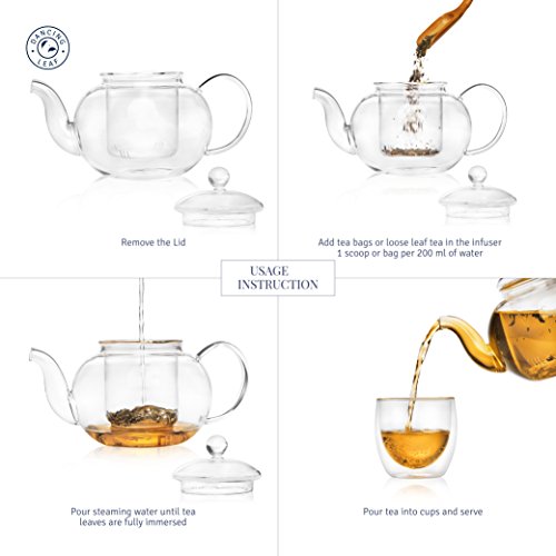 How To Use : Step 1 - Add tea bags or loose leaf tea in the infuser. 1 scoop or single tea bag per 200 ml of water. Step 2 - Pour steaming water until tea leaves are fully immersed. Step 3 - Cover the glass lid and allow tea to steep for a few minutes. St