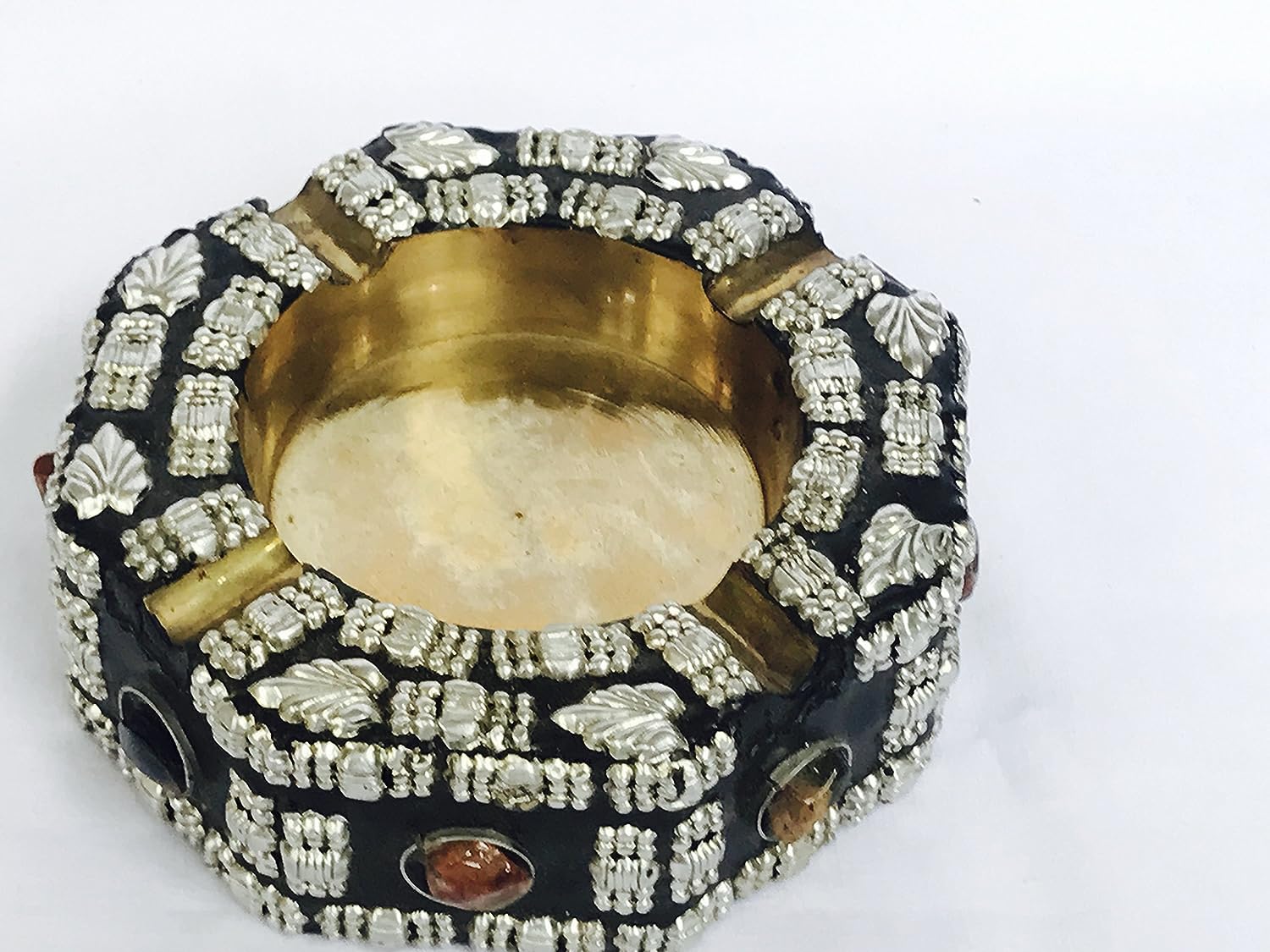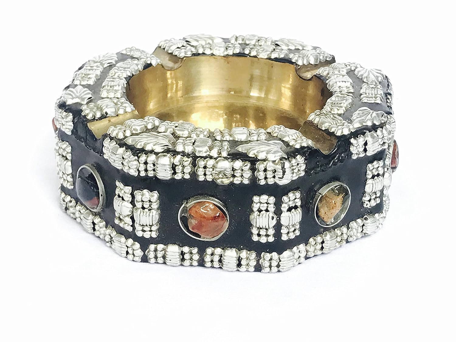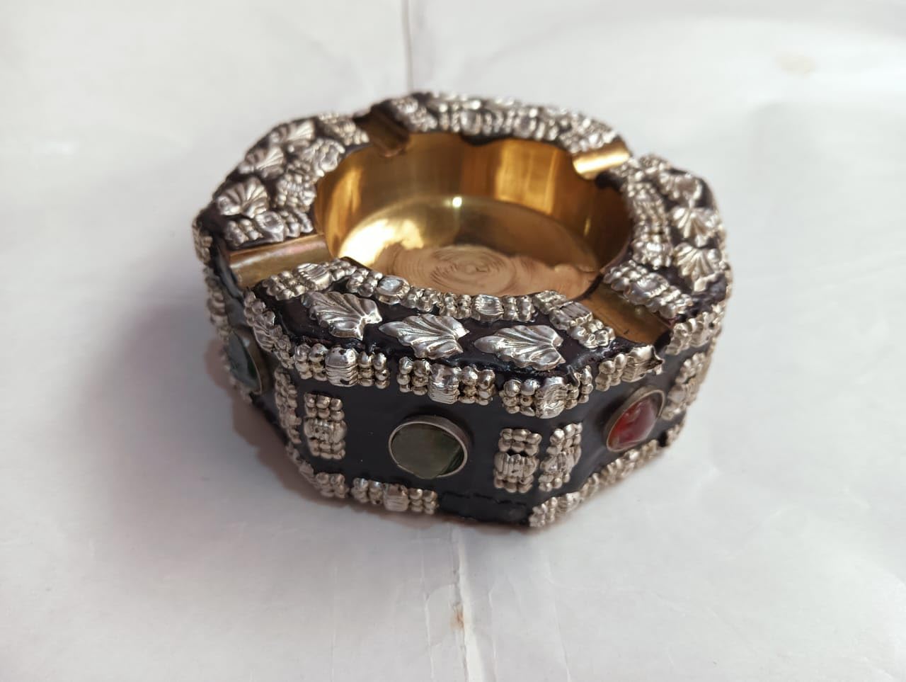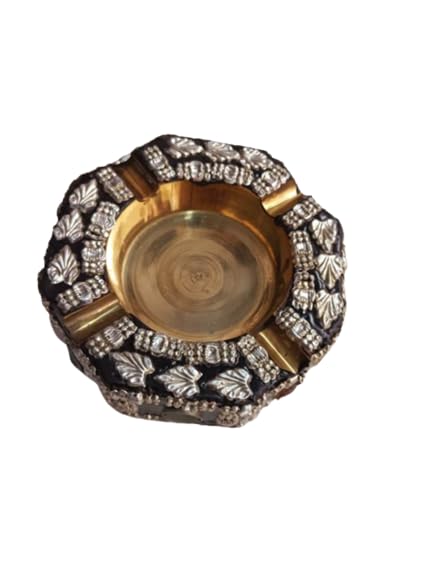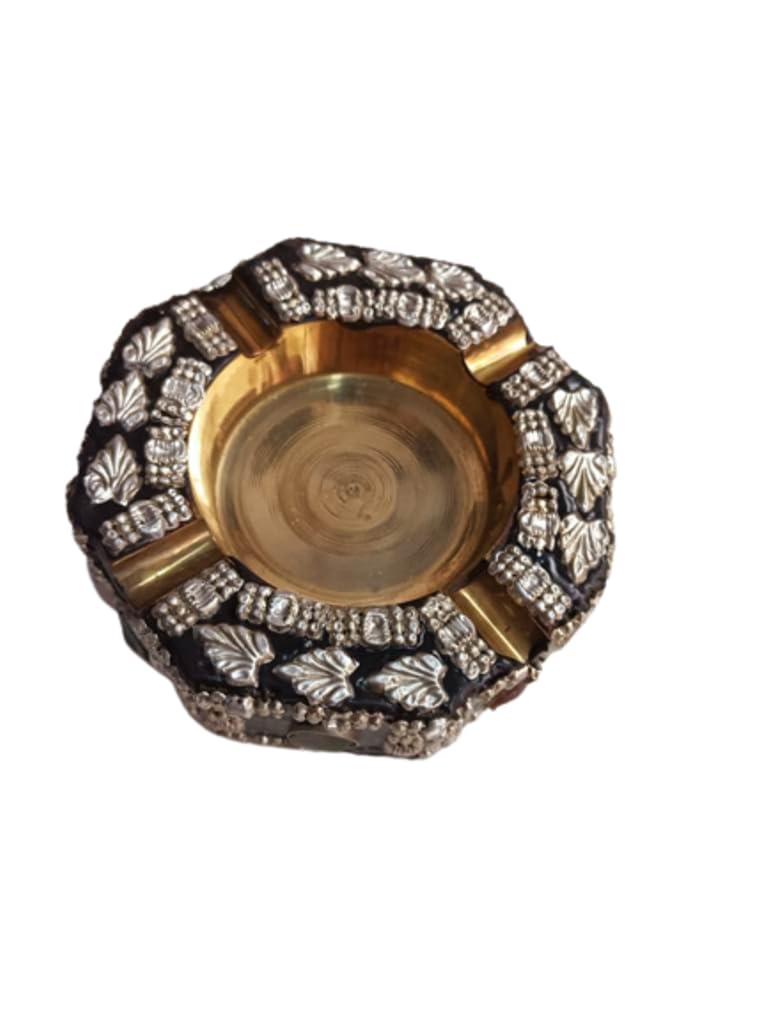 Ash tray are a must for any cigar smoker. We present a unique range of ash catchers that are artful with a modern twist. Grab one to compliment any smoking session with just the right touch of class. Handcrafted ashtray in wood with a steel cup inside and drawer. Hand made by skilled artisans with a finishing.Famous wood craftsmen of Nagina in north India have handcrafted this ashtray. There is a magnificent use of brass inlay to achieve decorative effects. Golden color brass metal coordinates well with dark wood. The ashtray as well as the 4 cigarette holders around it is in brass. Neither the cigarettes not the ashes come in contact with the wood directly. A drawer like storage space at the bottom enables you to store your cigarettes. Although an extremely functional object this ashtray is a decorative piece too. Just place it on your office or home desk and it adds to the overall decor.