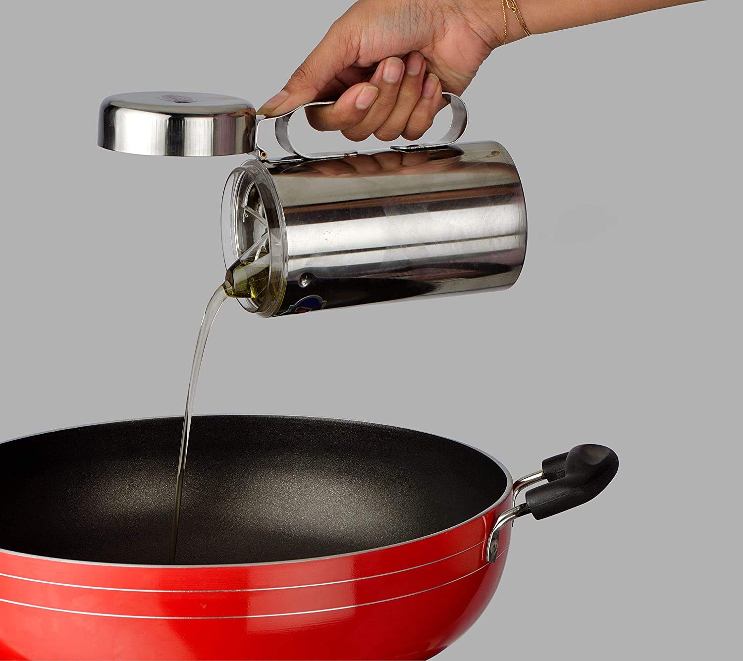 Stainless Steel comfortable handle for easy gripping and handling which does not let the container slip, Made of high grade Stainless Steel, BPA-free, chemical free, Anti-drip spout to prevent oil leakage, lid to prevent dust particles entering the container, The spout can be removed easily to clean the container from inside, Superior finish, stylish and durable; Corrosion-free, Capacity-1000 ml, Product Dimension- 9x9x17 cm