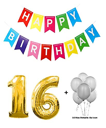 Number 16 Gold Foil Balloon & Happy Brthday Banner