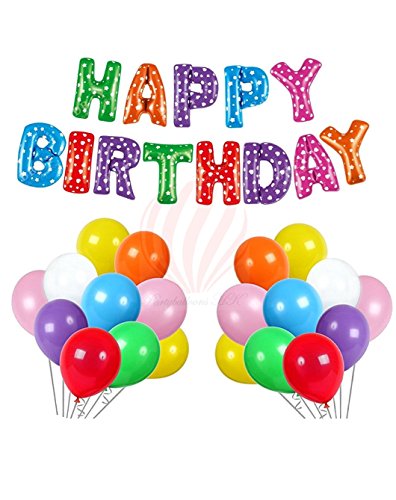 Perfect decoration set for Brthday party. Includes 13 Letters of HAPPY BrthDAY (each letter approx 16 inches high) and four stars made of mylar foil in a rainbow array of colors. Also includes ?50? colorful latex balloons. The foil balloons can be inflated with the included straw and can be mounted on a wall or ceiling with tape glue or the included string
