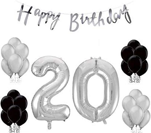 STOCK Happy Brthday banner with black/silver metallic balloons with foil number 2 (16 inches) black/silver 50pcs combo includes: 1 Silver happy Brthday banner Silver 16\ latex foil balloons number.; silver happy Brthday banner needs DIY before decoration.; happy Brthday banner makes your party more beautiful and attractive.