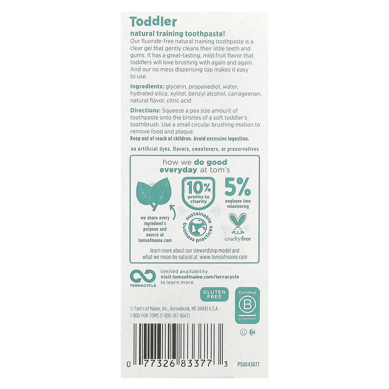 WHAT YOU'LL GET: Three 1.75-ounce tubes of Tom's of Maine Toddler Training Fluoride-Free Toothpaste in Mild Fruit Flavor FLUORIDE-FREE: Specially formulated for kids 3-24 months so it's safe if swallowed GENTLY CLEANS: Natural baby toothpaste gently cleans tongue and teeth with easy-to-use no-mess top RECYCLABLE TUBE: Look for the blue recycling flag squeeze out as much toothpaste as you can replace the cap and recycle TAKE CARE OF YOURSELF NATURALLY: Contains no artificial preservatives colors or flavors and is not tested on animals