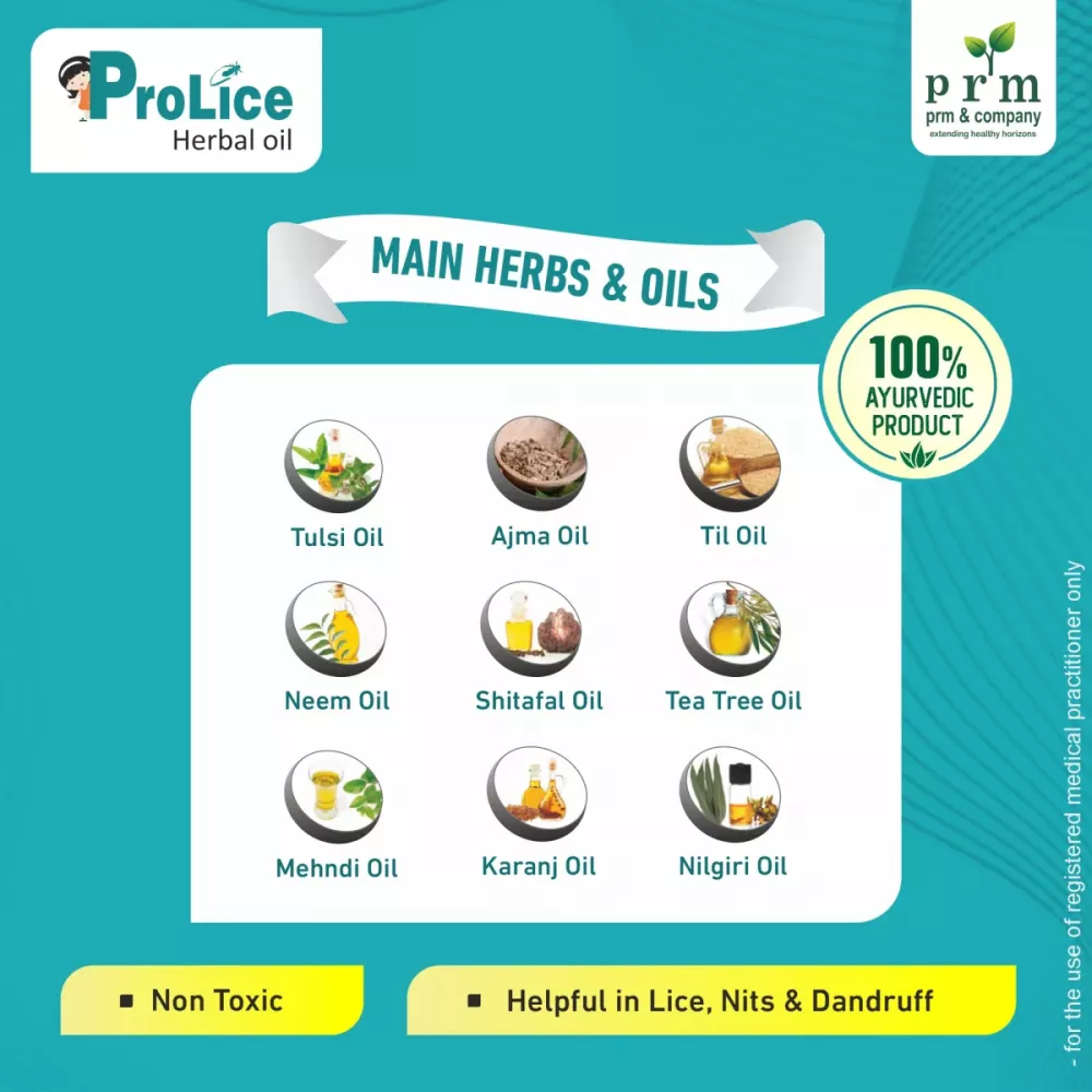 Prolice herbal lice care oil is made of 15 natural and insecticidal herbal ingredients like shikakai oil, tulsi oil, karanj oil, sitafal oil, coconut oil, til oil, neem oil and many more. that helps to remove lice, nits & their eggs, dandruff. it is also helpful in improving hair quality.