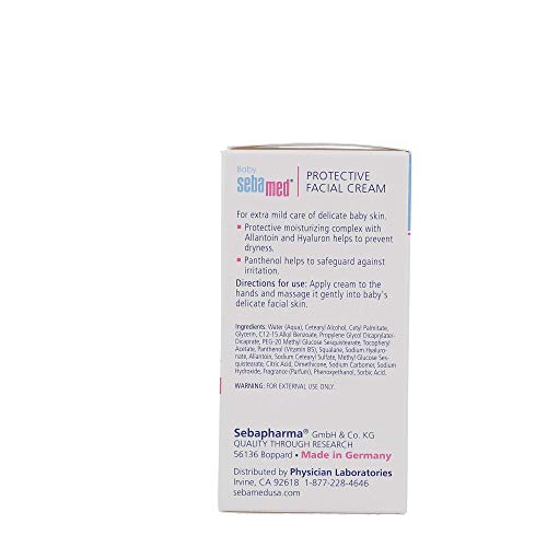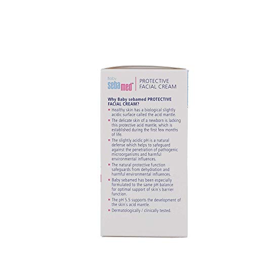 The moisturizing complex of hyaluronic acid and squalene prevents dryness and enhances the protective acid mantle of baby's very delicate facial skin. Panthenol vitamin e and lipid compounds protect against irritation also due to salivary rash. Light textured cream which does not leave any greasy residue. Sebamed baby protective facial cream is free from paraffin/ parabens/ formaldehyde/ dioxin made in Germany effective hydration prevents dryness panthenol and lipid compound protect against irritation around the mouth from saliva vitamin e safeguards against harmful environmental influences on occlusive rich in panthenol and allantoin to soothe and regenerate irritated skin easy to apply and readily absorbed oil in water emulsion ideal from one month onwards clinically proven the barrier function of the skin and hydration were improved. Hydration level increased by 13 percent and tewl decreased by 46 percent.
