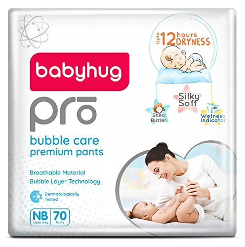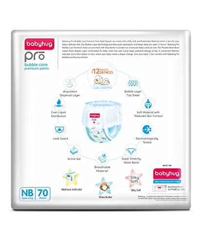 Babyhug Pro bubble care premium pant style diapers are made with a silky soft & breathable material best for your baby's delicate skin. The bubble layer technology provides quick absorption and keeps baby dry for upto 12 hours. These diapers are enriched with shea butter to protect & moisturise baby's skin. The flexible waist band makes them super comfortable while the leak guard keeps potential leakage at bay. A convenient wetness indicator turns from yellow to blue when it is time for a diaper change.