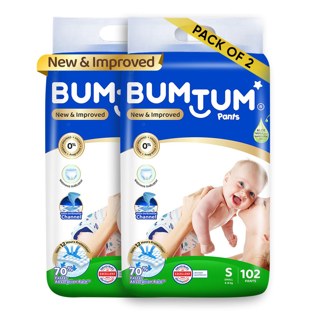 Bumtum Baby Diaper Pants, Small Size, 204 Count, Double Layer Leakage Protection Infused With Aloe Vera, Cottony Soft High Absorb Technology