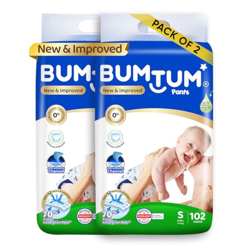 Bumtum Baby Diaper Pants Small/S Size 204 Count Double Layer Leakage Protection Infused With Aloe Vera Cottony Soft High Absorb Technology
