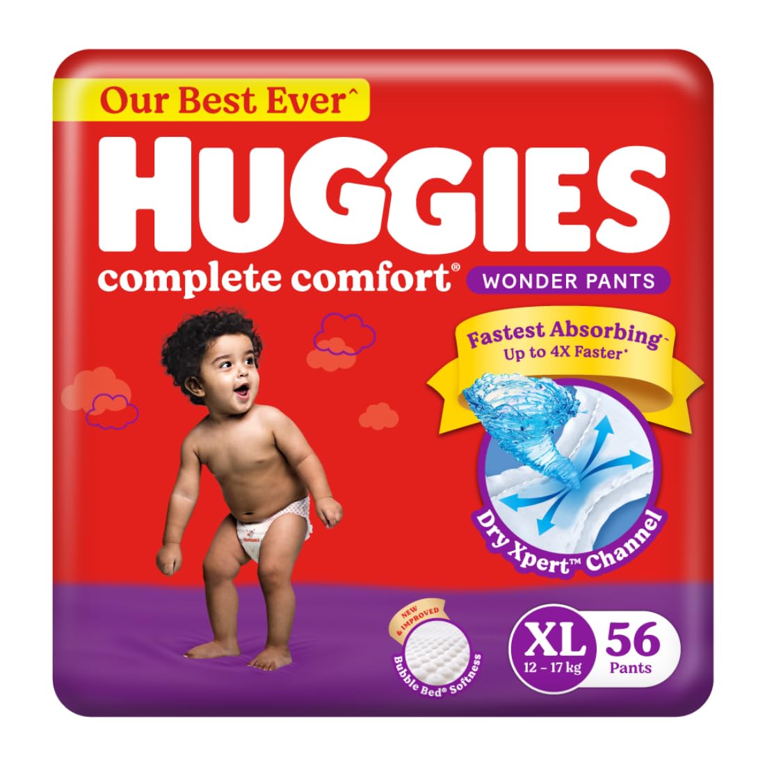 Huggies Complete Comfort Wonder Pants | Pant Style Baby Diapers XL Size, 56 Count | India's Fastest Absorbing Diaper, Patented Dry Xpert Channel, Ideal for 12 to 17 Kgs