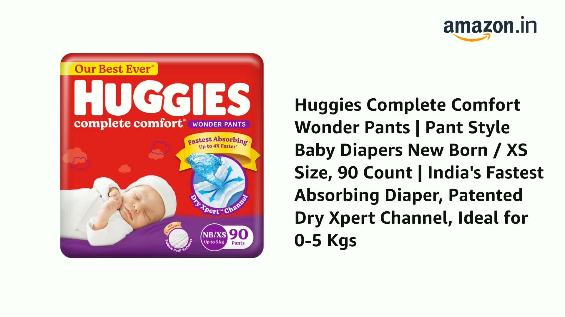 Introducing the New and Improved Huggies Complete Comfort Wonder Pants - India's Fastest Absorbing Diaper. Designed to provide maximum comfort and absorbency for your little one these are our best ever diaper pants. With our patented Dry Xpert technology that spreads urine evenly across the diaper - these diaper pants are now up to 4x Faster in absorbing urine ensuring your baby stays dry and comfortable. But that's not all! Our diaper pants also feature India's 1st Bubble Bed technology that provides a soft inner bubble layer to wrap your baby in ultimate softness. Made from air-friendly breathable material these pants help your baby's skin breathe keeping them comfortable throughout the day protecting them from rashes. And with up to 12 hours of overnight absorption you can both have a peaceful night's sleep. We understand how important it is to keep your baby dry at all times which is why our diaper pants come with double leak guard protection. This extra padding helps prevent thigh leakage ensuring there are no messes to deal with. Choose from a range of sizes of our Pant Style Diapers - including diapers New born /XS size diapers S size (small) diapers M size (medium) diapers L size (large) diapers XL size (extra large) diapers XXL size (double extra large) and diapers XXXL size (triple extra large) - making it suitable for babies of all ages and sizes. Trust Huggies Complete Comfort Wonder Pants for complete care and protection for your little one. Add the new and improved Huggies Complete Comfort Wonder Pants to your shopping cart today! Available on Amazon.