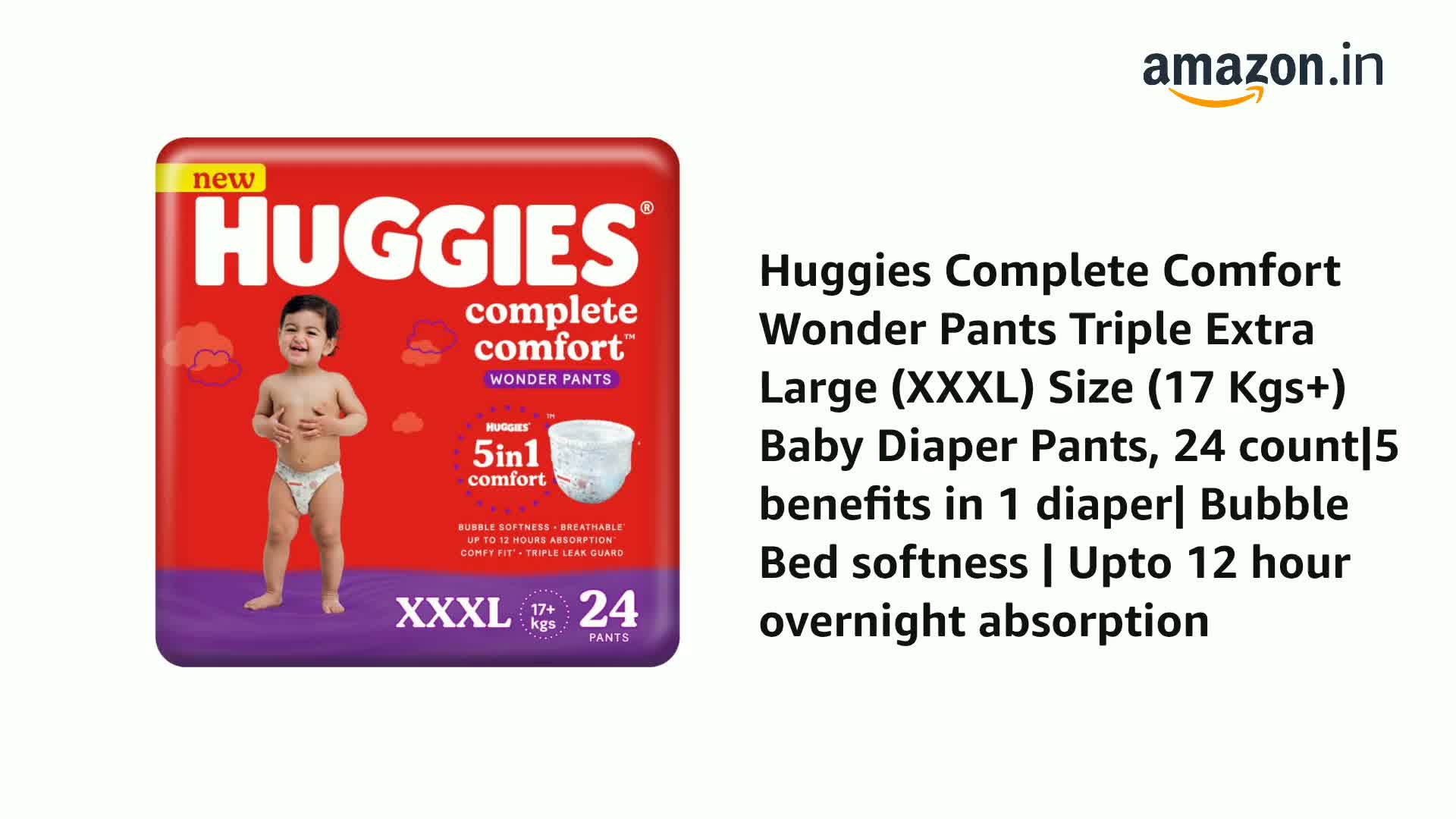 Huggies Complete ComfortTM Wonder Pants provides 5 benefits in 1 diaper. With India's 1st Pants with Bubble Bed technology Huggies provides a soft inner bubble layer that wraps your baby in softness. Made from air friendly material our diaper pants help your baby's skin to breathe. Up to 12 Hours of Overnight Absorption allows you and your baby to have a comfortable sleep. Triple leak guard provides extra padding to fight leakage and Comfy fit waistband ensures a snug fit for your baby. Our Pant style diapers are available in all sizes from Newborn/XS S M L XL XXL & XXXL sizes.