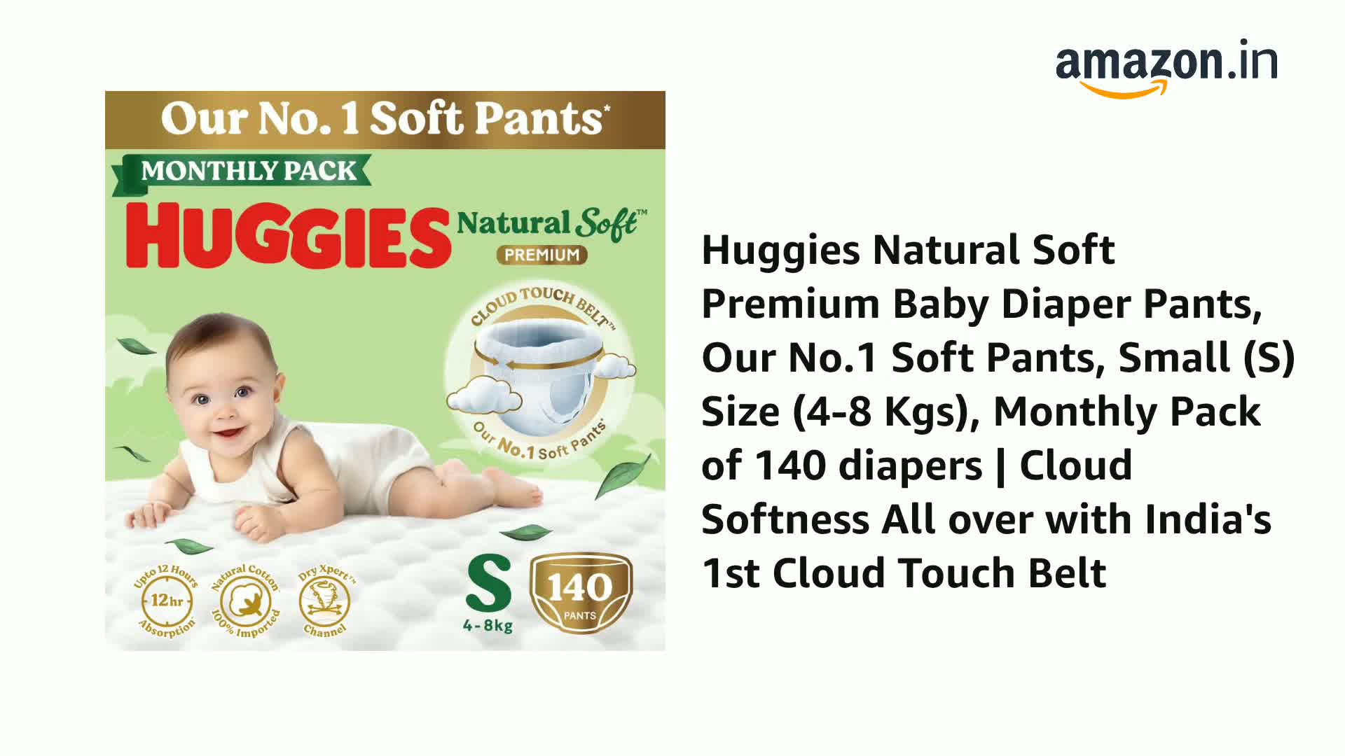 Huggies Natural Soft Premium Baby Diaper Pants, Our No.1 Soft Pants, Small (S) Size (4-8 Kgs), Monthly Pack of 140 diapers | Cloud Softness All over with India's 1st Cloud Touch Belt