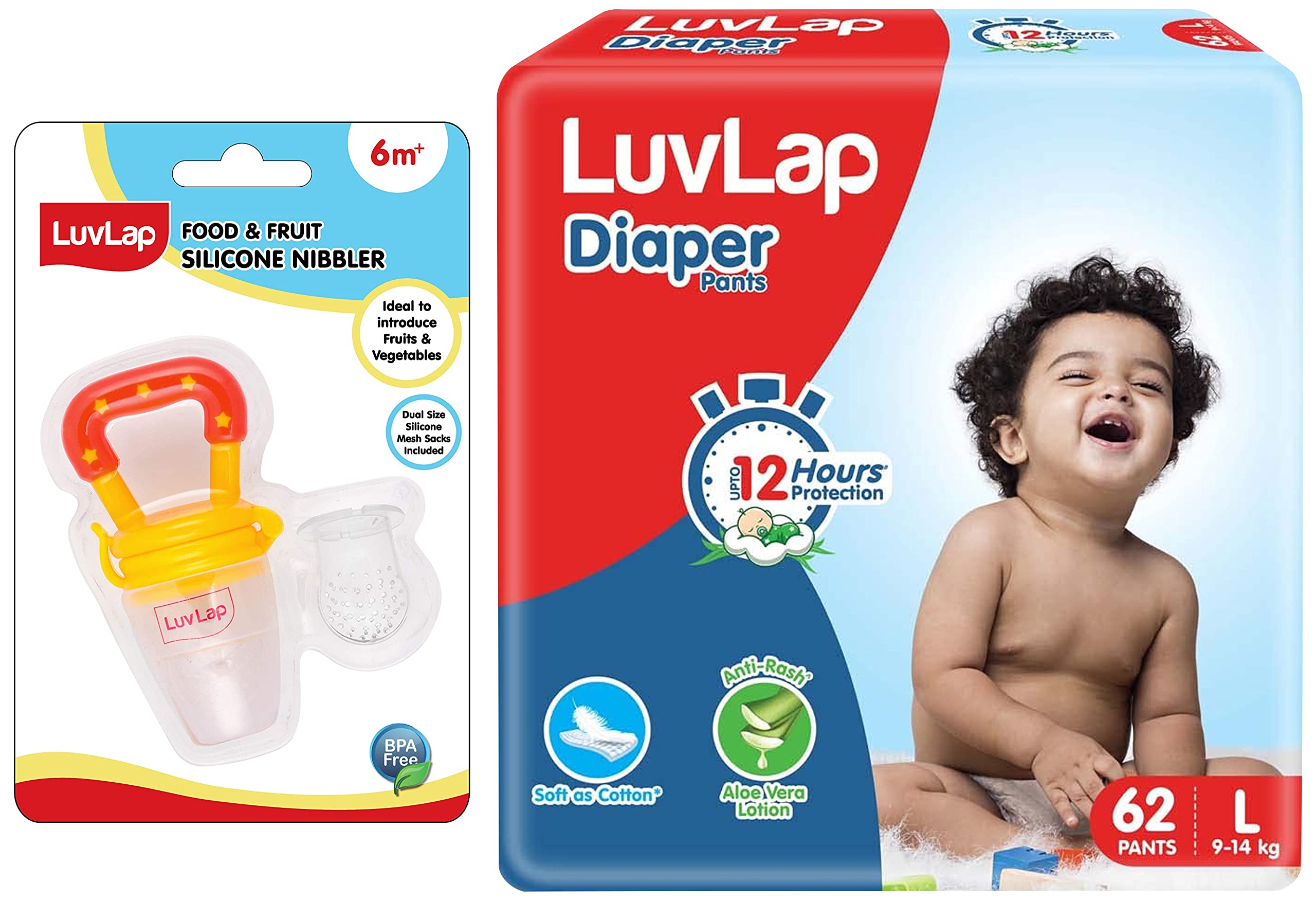 LuvLap Baby Diaper Pants L Size (Large) with Aloe Vera Lotion for rash protection Pack of 62 Count with upto 12Hr protection For babies of 9 to 14KgAvailable sizes - Newborn (upto 5Kg) Small (4-8 Kg) Medium (7-12Kg) Large (9-14Kg) XL (12-17Kg)LuvLap Silicone Food/Fruit Nibbler with Extra Mesh Soft Pacifier/Feeder Teether for Infant Baby Infant Joystar Yellow BPA FreeFruit nibbler and teething toy to provide gentle relief to gums. Serves dual purpose of feeding fruit and vegetables to babies and can also be used as a teether. Can be filled with chilled fruits/vegetables to provide added relief. Made with bpa free food grade plastic and soft silicone it comes in attractive handle designs to EN gage the baby and is easy to hold and nibble upon.