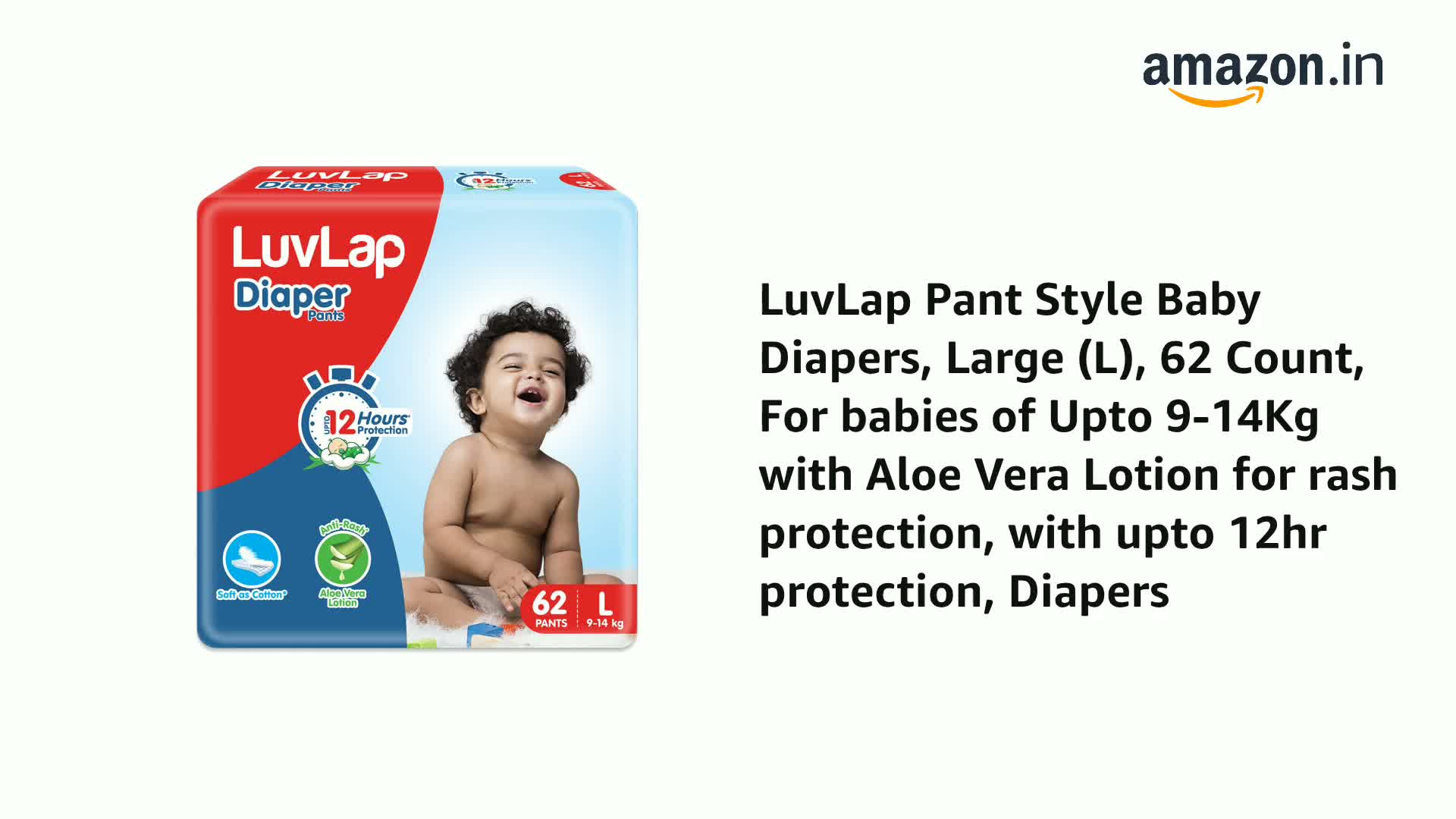 LuvLap Pant Style Baby Diapers, Large (L), 62 Count, For babies of Upto 9-14Kg with Aloe Vera Lotion for rash protection, with upto 12hr protection, Diapers