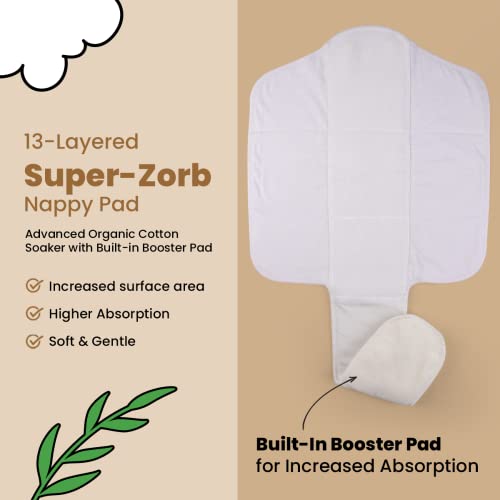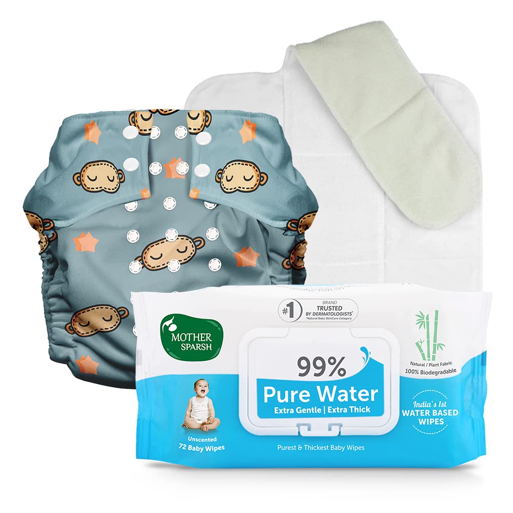Mother Sparsh Plant Powered Cloth Diaper with FREE 99% Pure Water Baby Wipes (72Pcs) | Reusable Cloth Diaper for Babies with Built in Booster Pad | Unscented Baby Wipes (Domino)