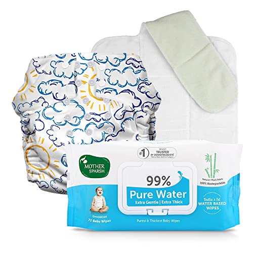 HomeBabyDiaperingBaby WipesMother Sparsh Plant Powered Cloth Diaper with FREE 99% Pure Water Baby Wipes (72Pcs) | Reusable Cloth Diaper for Babies with Built in Booster Pad (Howdy)| Unscented Baby Wipes