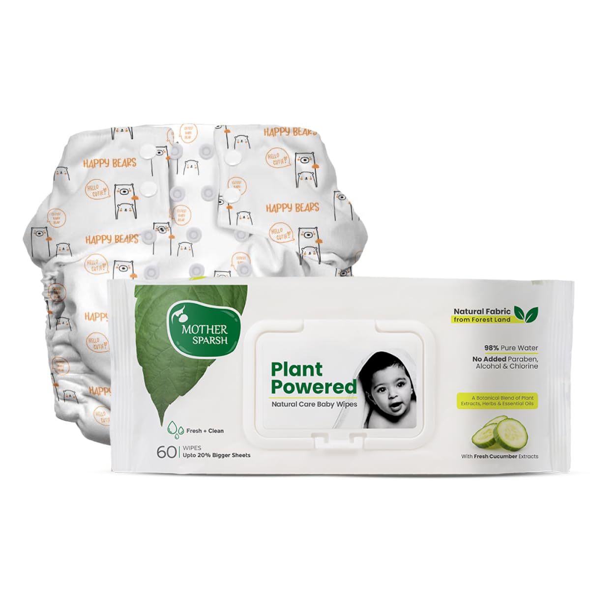 Mother Sparsh Plant Powered Cloth Diaper with FREE Plant Powered Water Baby Wipes (60Pcs) | Reusable Cloth Diaper for Babies with Built in Booster Pad | Cloth Like baby Wipes (B.Cute)